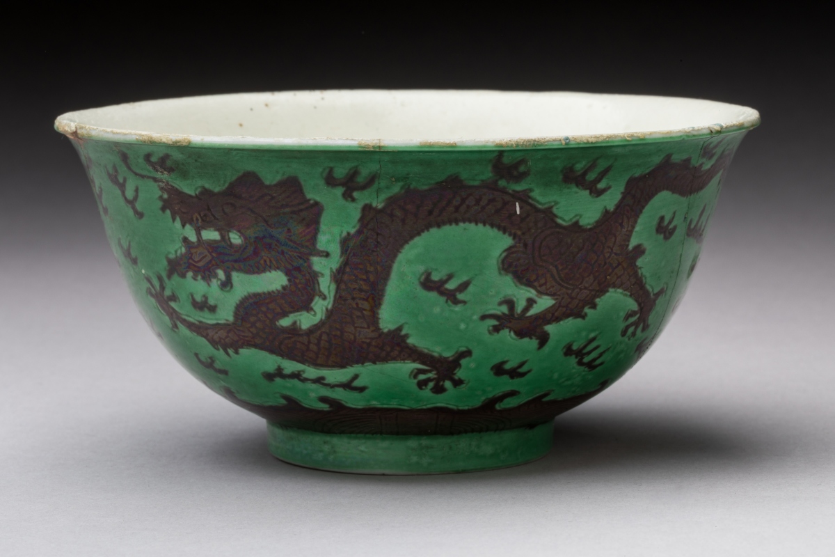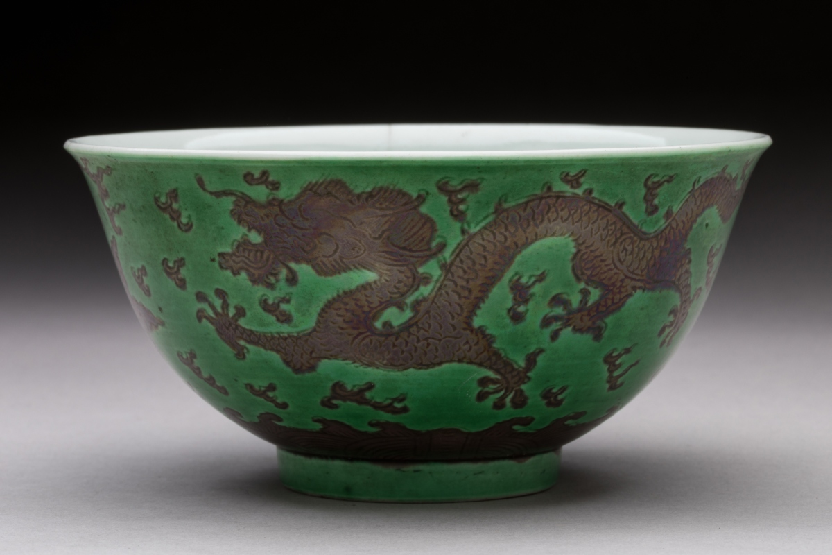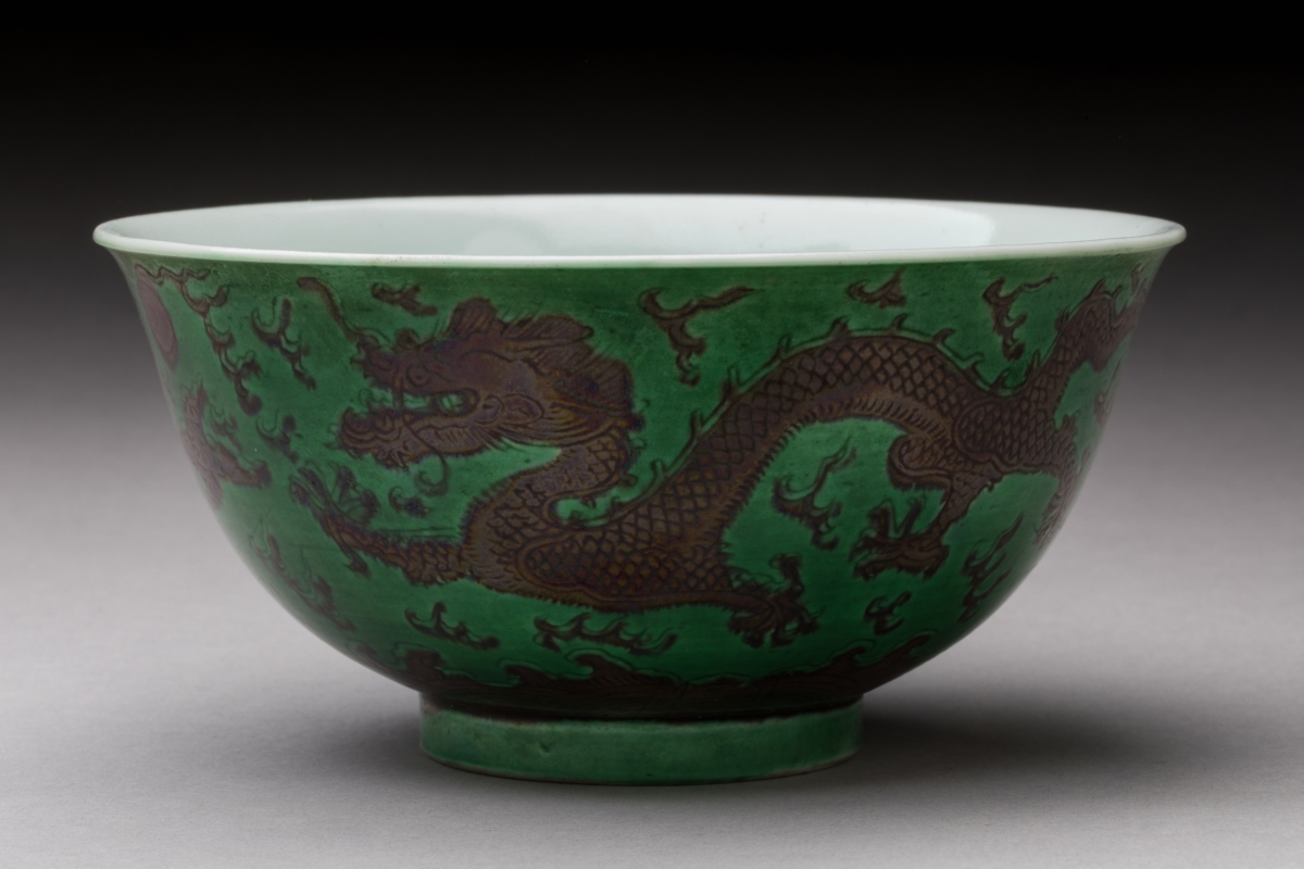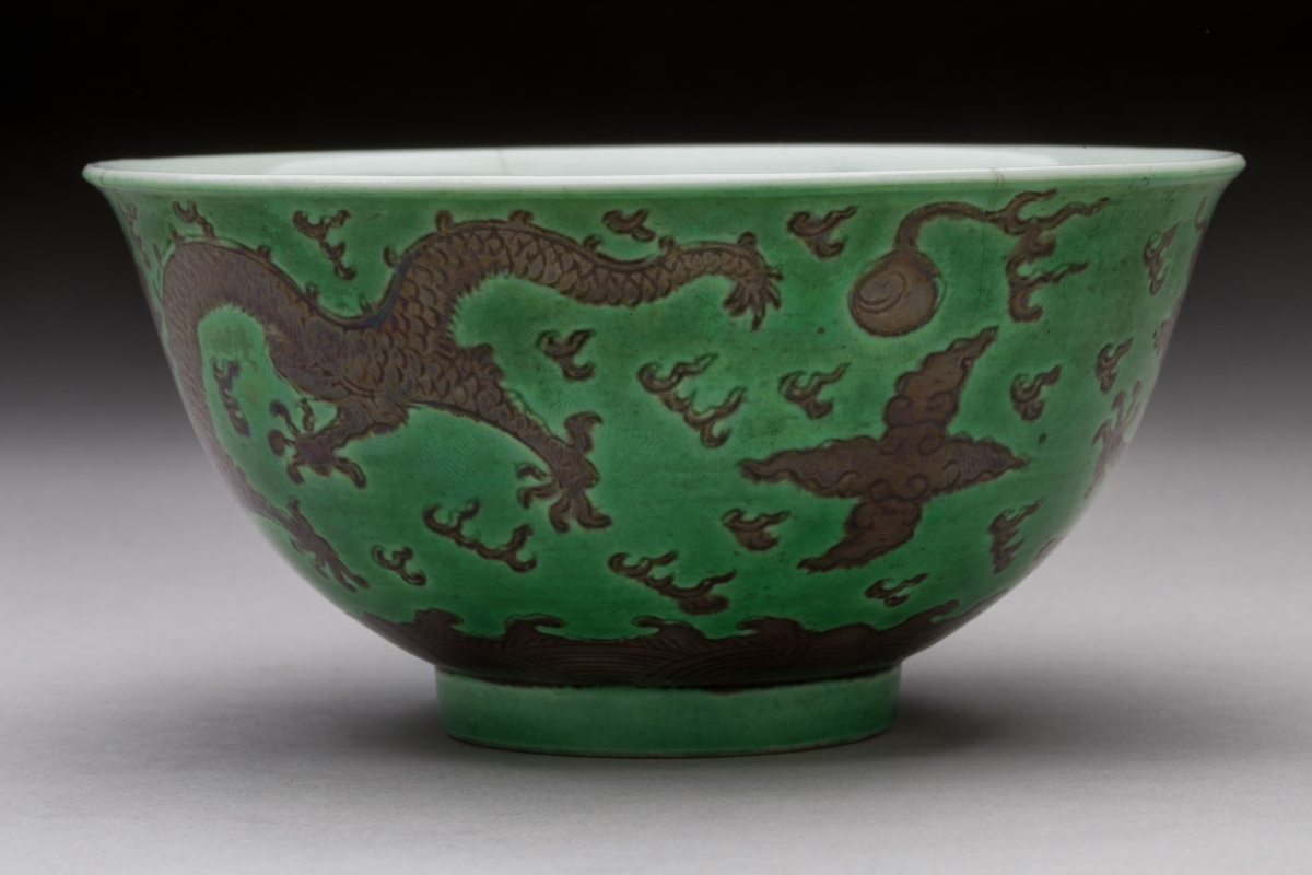 CHINA, DAOGUANG period. Three green and manganese enameled porcelain BOWLS decorated with dragons chasing after the sacred pearl. Daoguang six-character seal mark in zhuanshu script on the base.