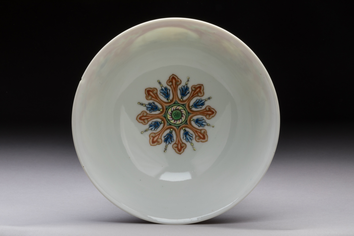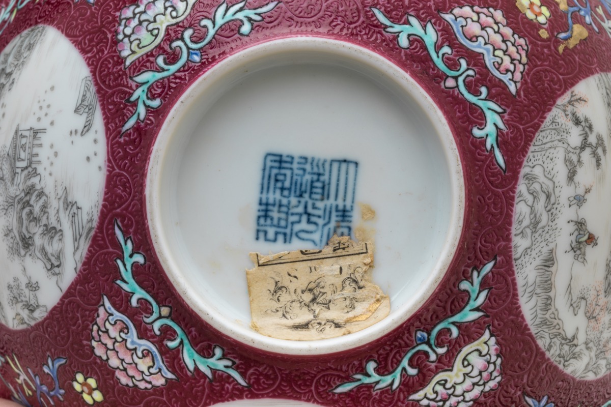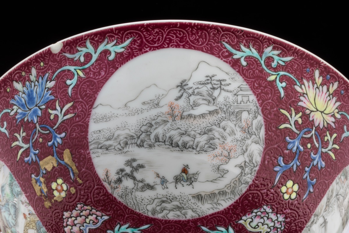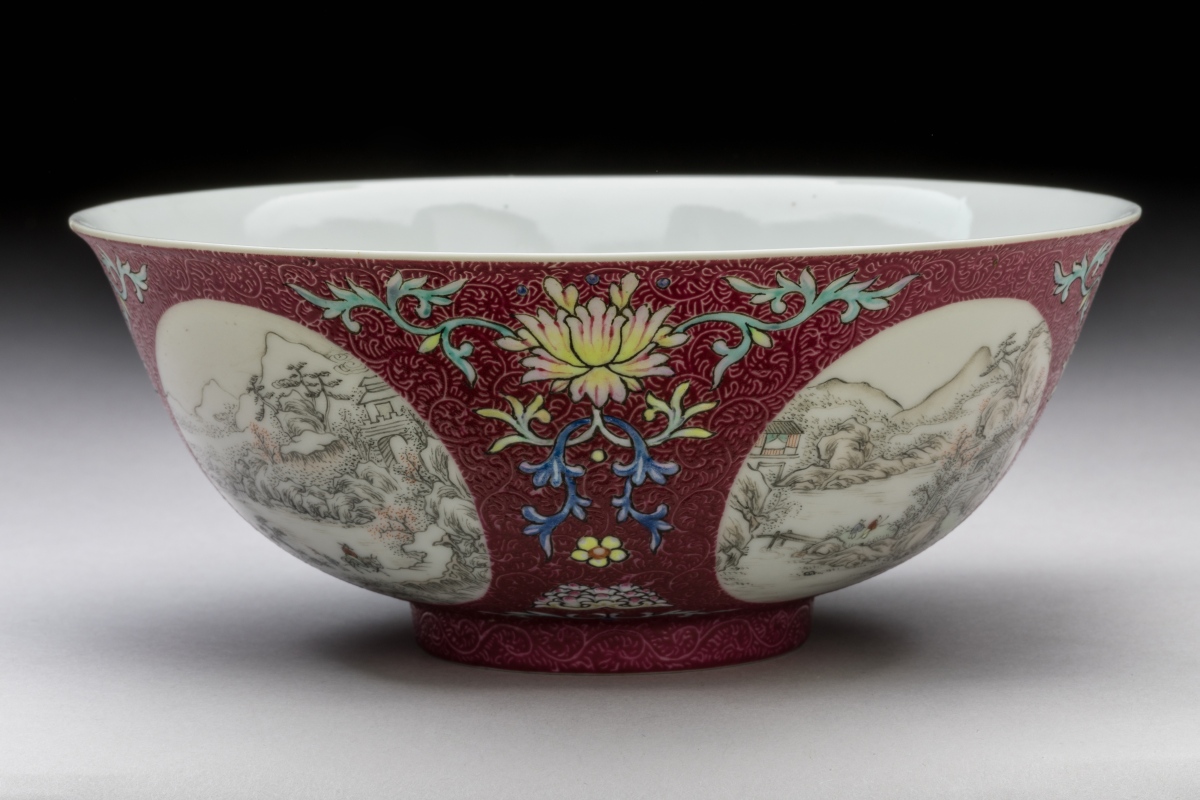 BOL à bord évasé en porcelaine émaillée polychrome à décor dans quatre médaillons en grisaille de peintures lacustres d'hiver inspirées de peintures impériales sur fond rubis à décor dit "sgraffiato" (ya dao) et orné de fleurs de lotus dans leurs rinceaux entre chaque médaillon. L'intérieur décoré en émaux polychromes d'une rosace à huit branches au centre.