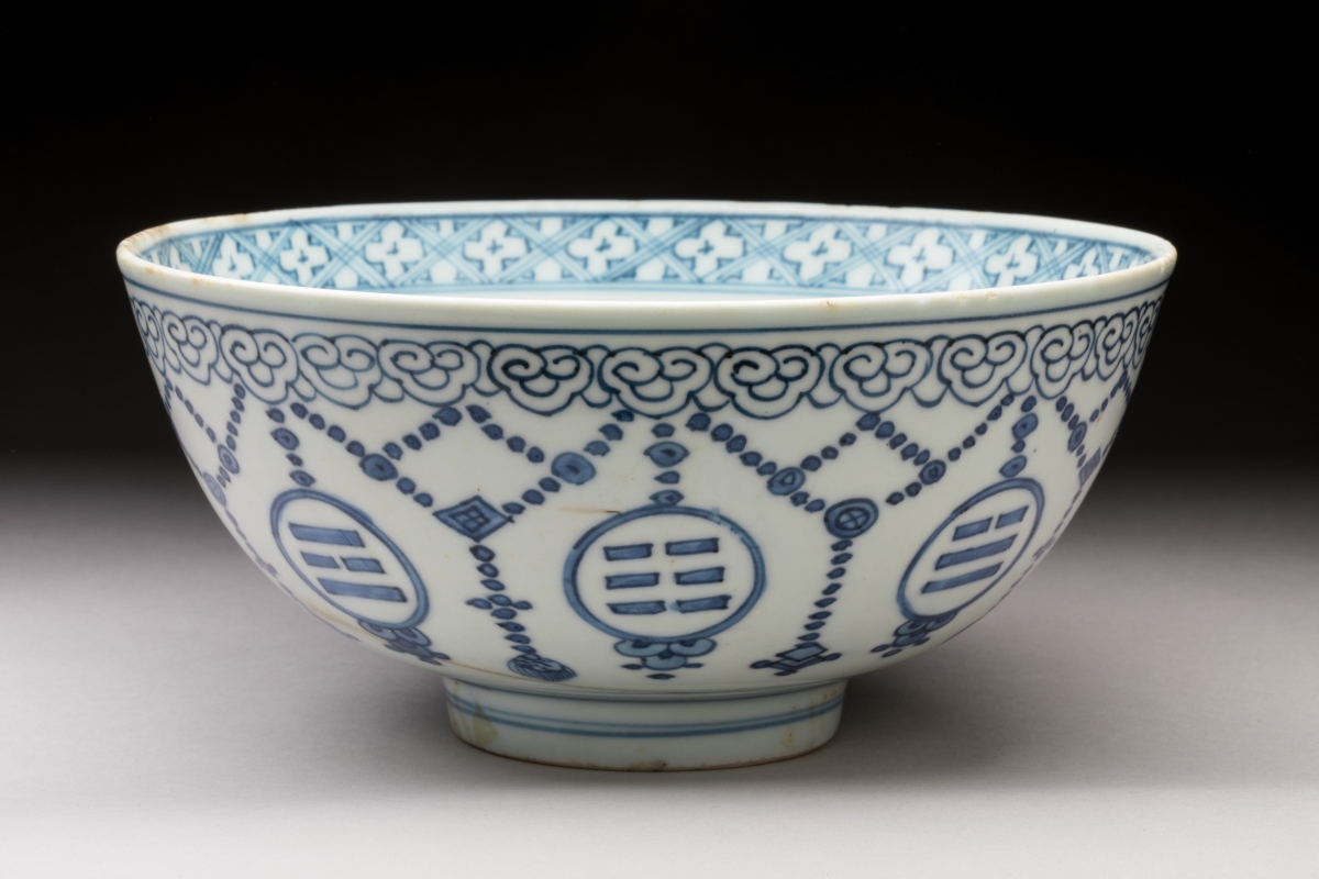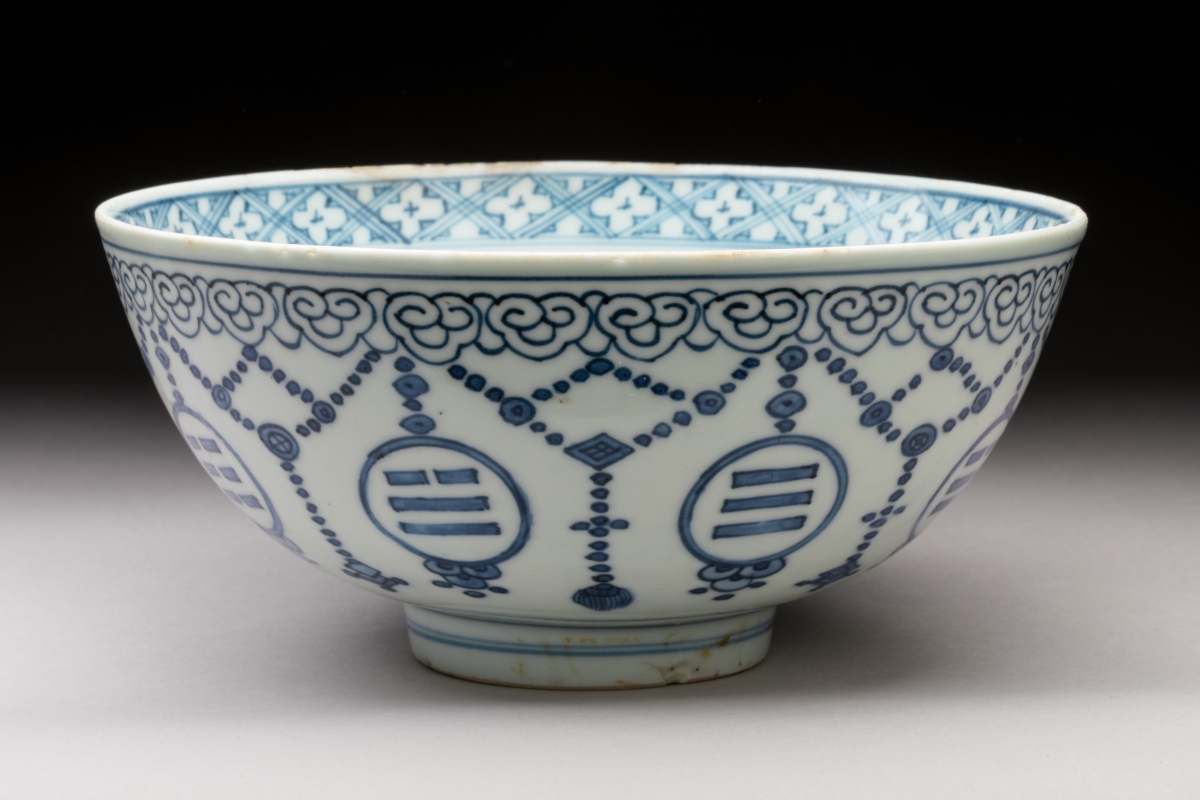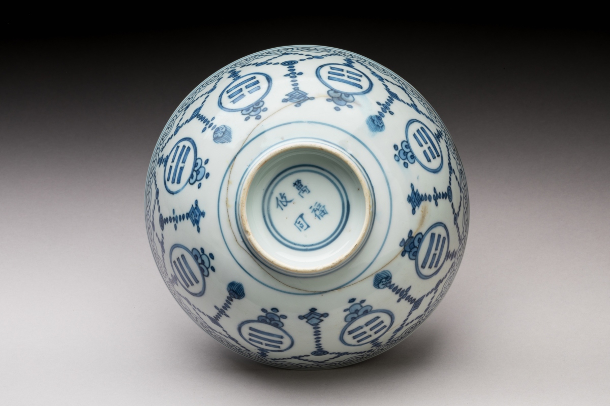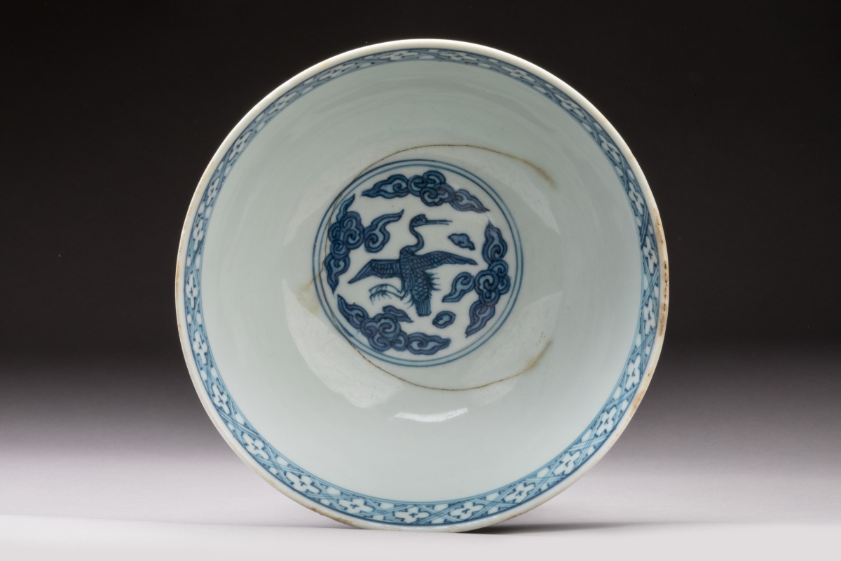 BOL en porcelaine blanche émaillée en bleu sous couverte à décor sur la panse de breloques, frises de ruyi et trigrammes, l'intérieur orné dans un médaillon central d'une grue et d'une frise de croisillons le long de la bordure interne.