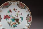 à décor en émaux polychromes de la famille rose de pivoines et de feuillages au centre, l'aile ornée de pivoines et rinceaux fleuris sur fond de motifs géométriques dans des réserves polylobées et de pendeloques.