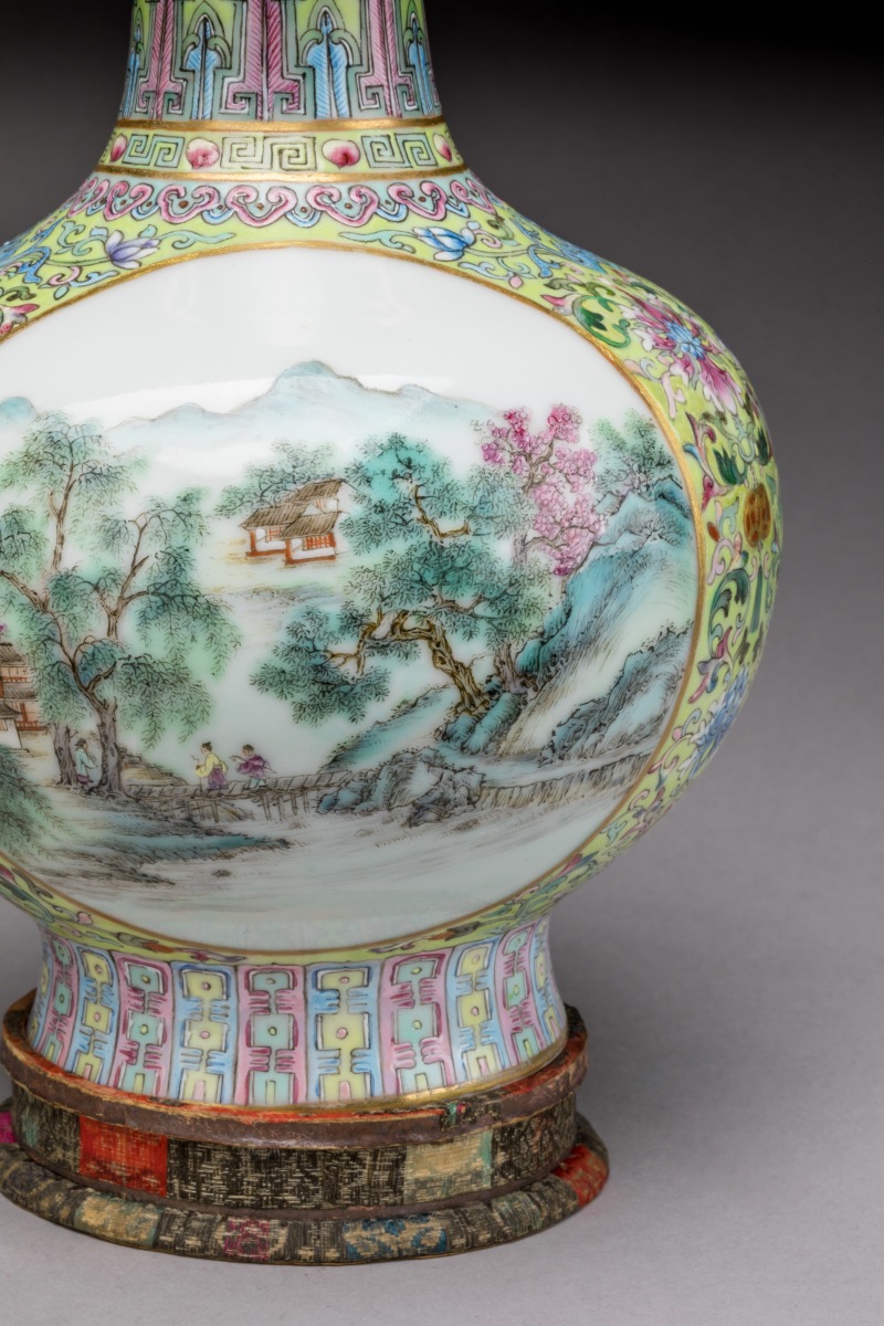 sur piédouche à haut col, à deux anses en porcelaine émaillée biansati famille rose décorée à fond amande ornée de semis de fleurs polychrome, et de paysages et de figures dans des réserves ovales.