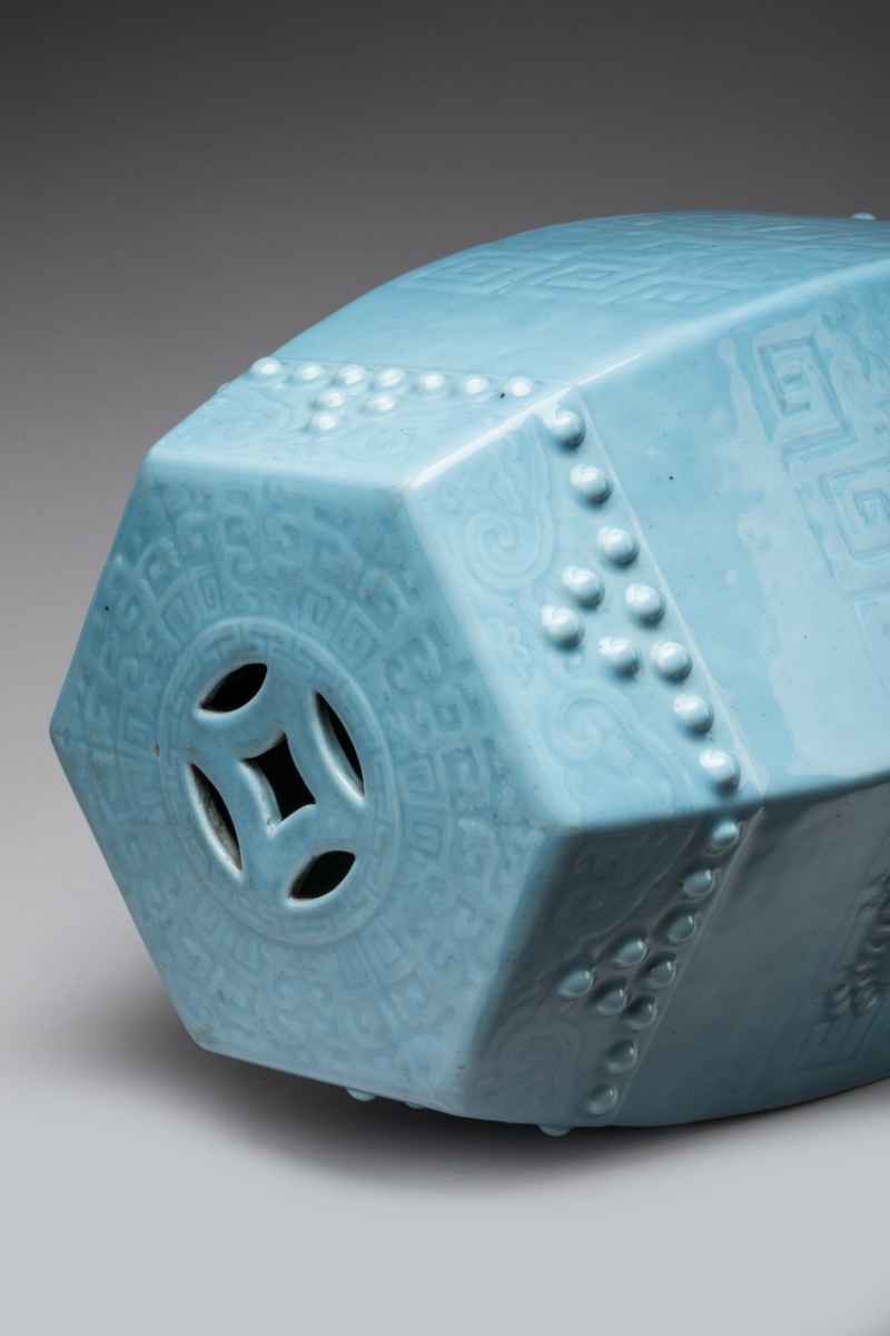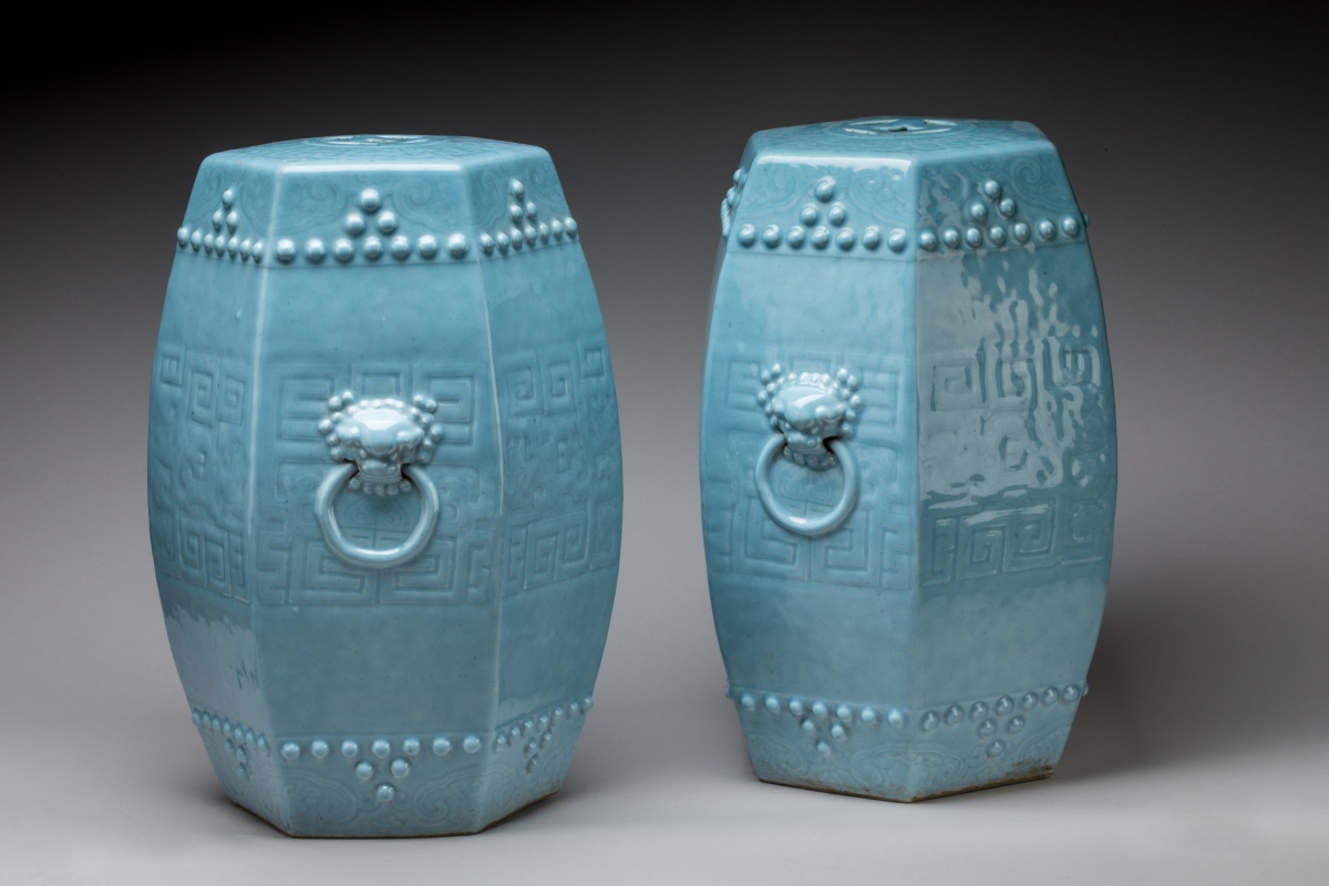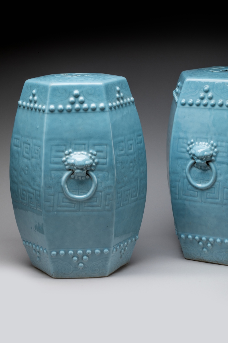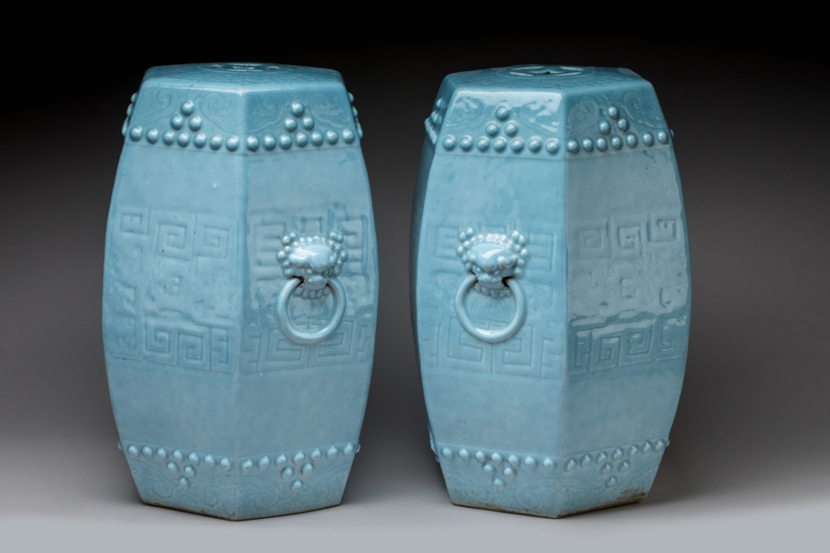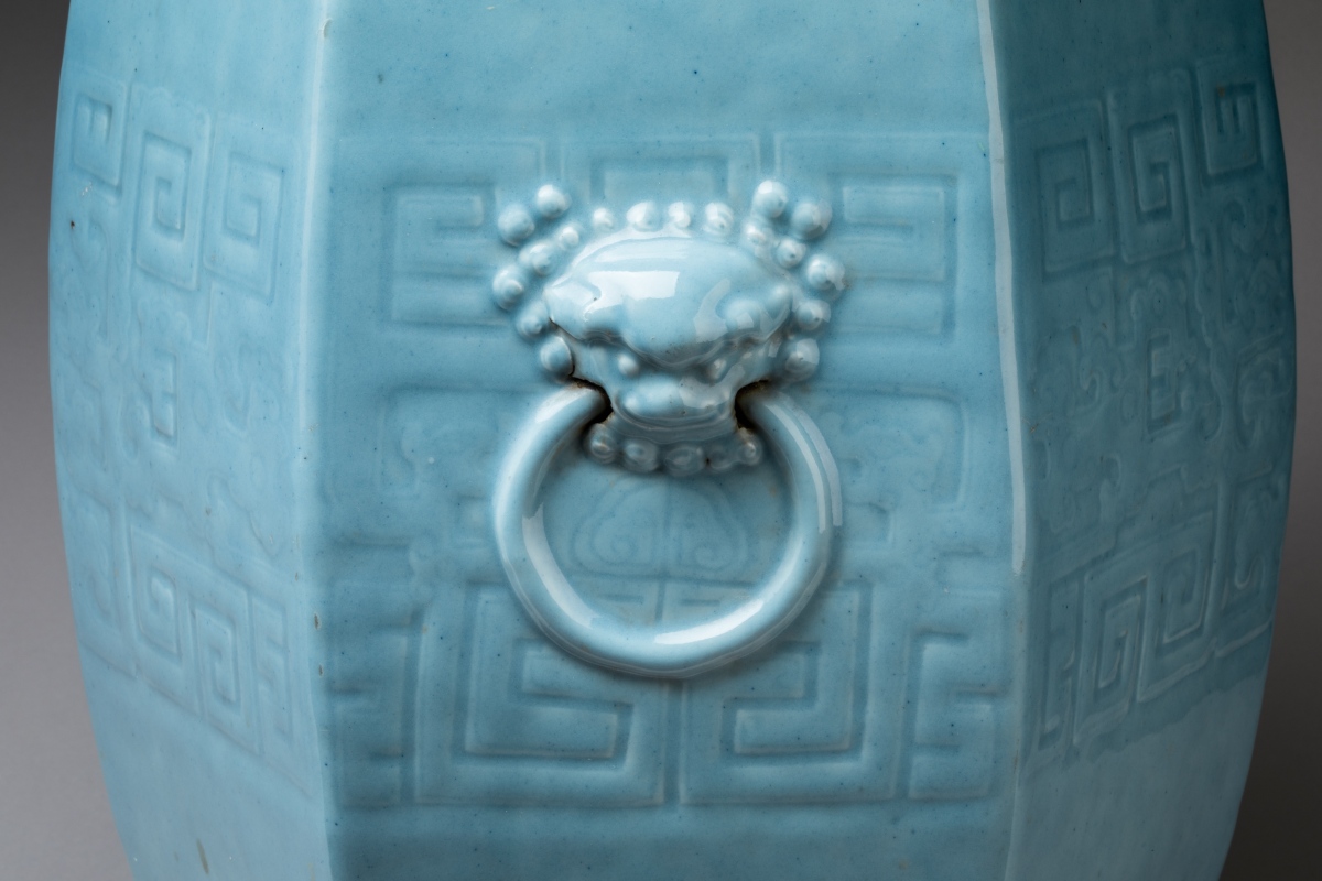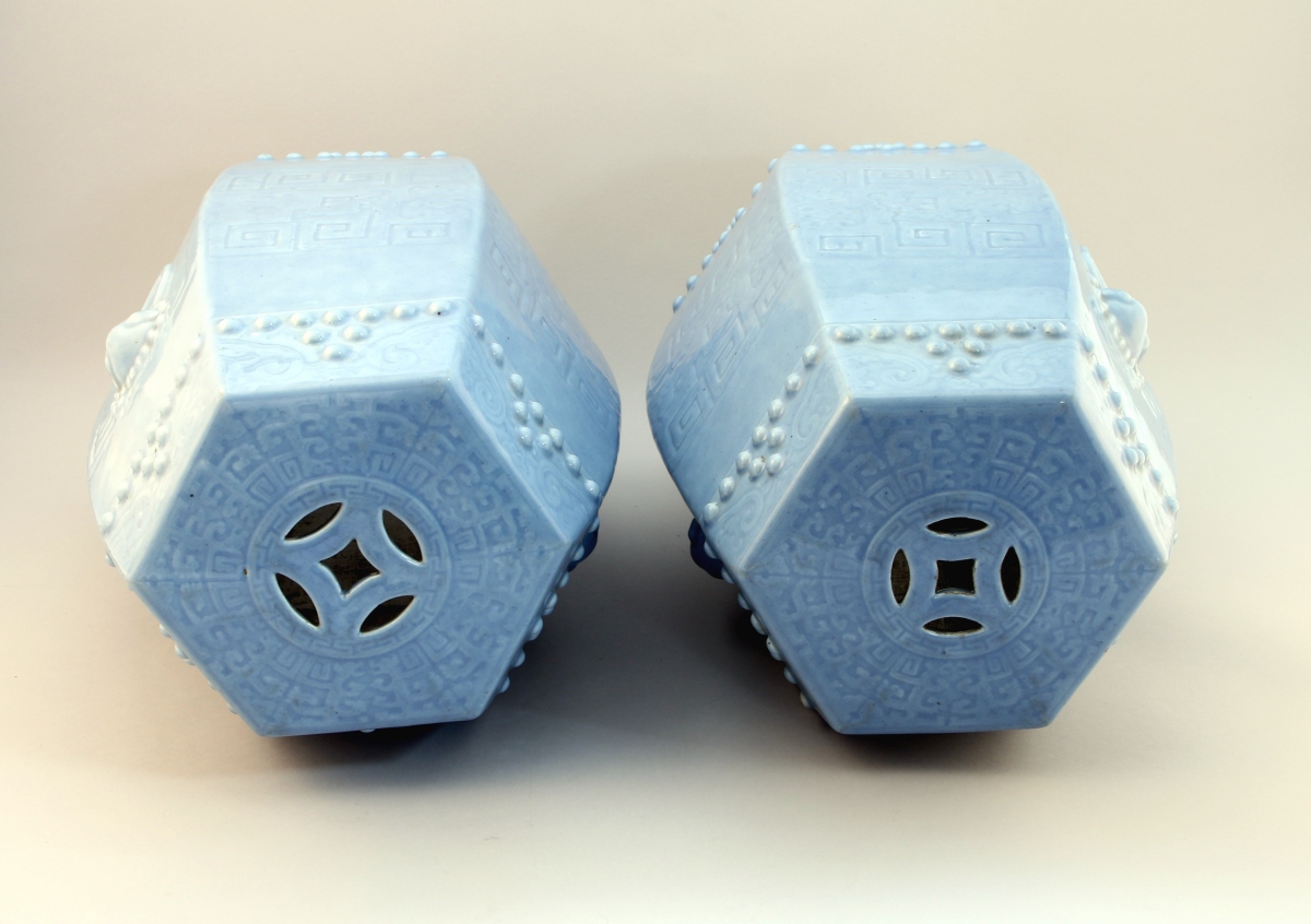 Paire de TABOURETS hexagonaux TONNELETS en porcelaine émaillée bleu "clair de lune" à décor incisé sous couverte de grecques et motifs de ruyi, des clous et les anses en forme de tête de chimère supportant des anneaux figurés en relief, l'assise ajourée d'un motif géométrique.