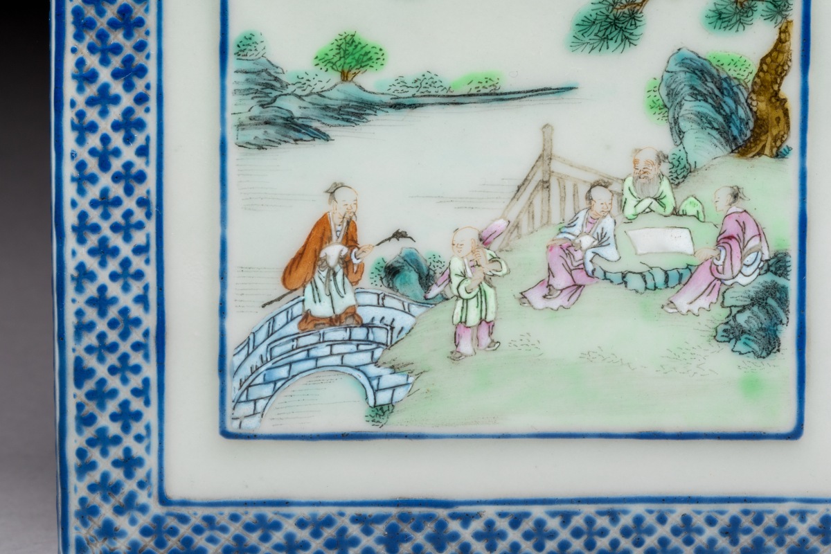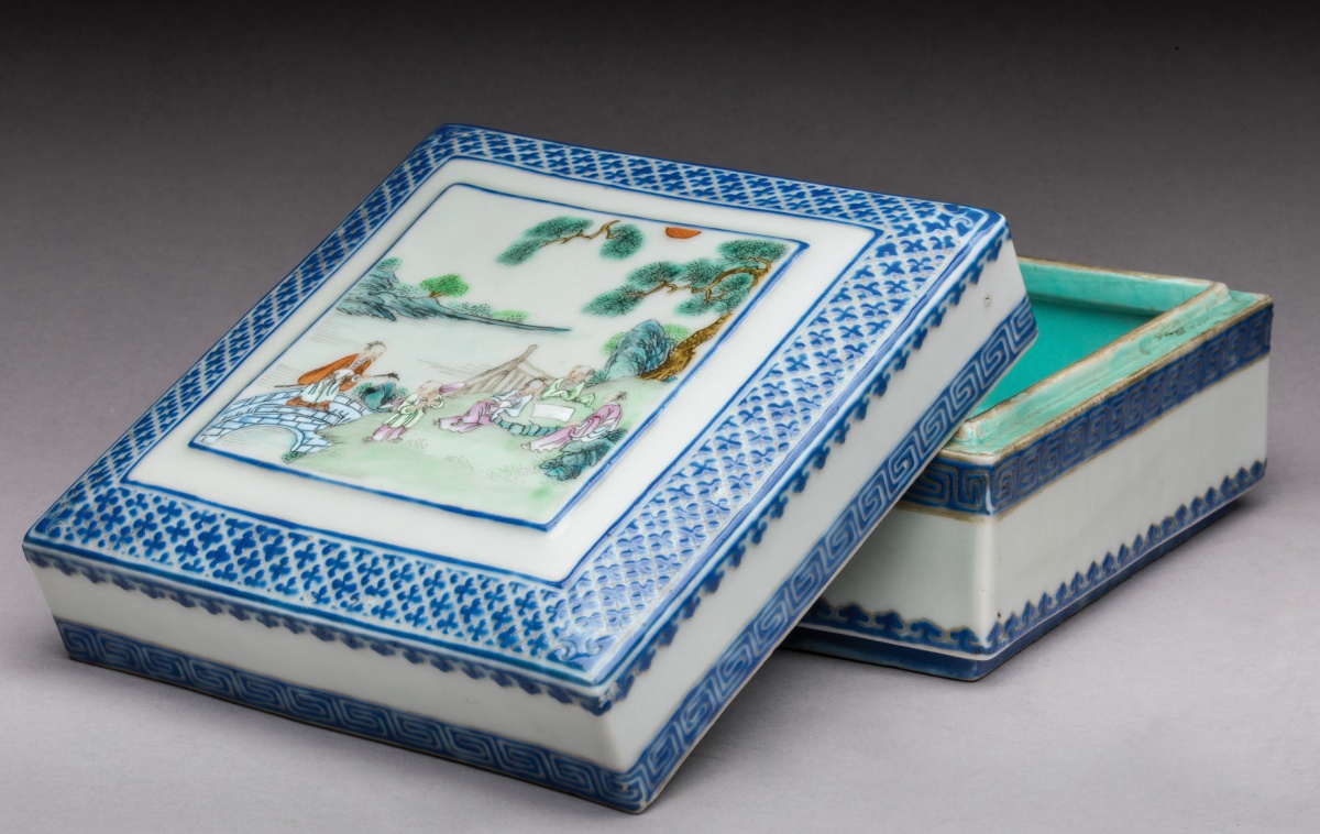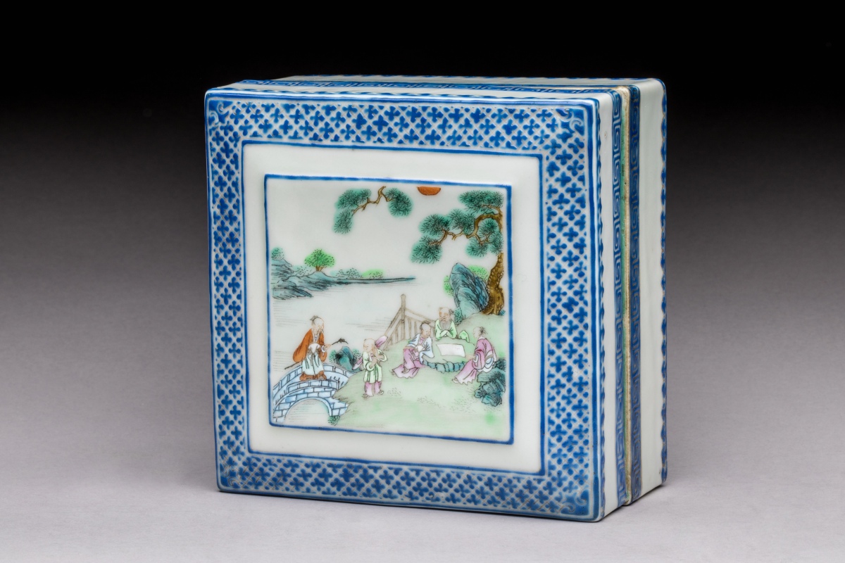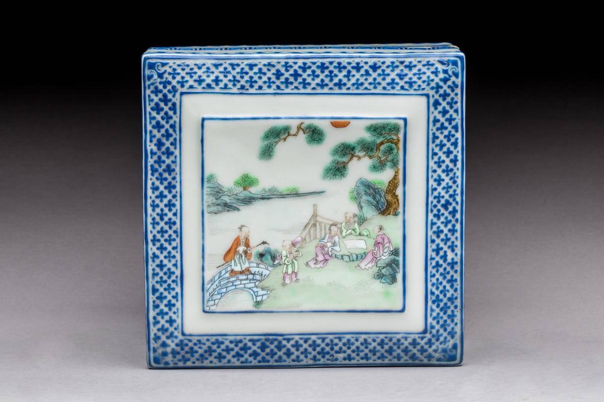 émaillée polychrome à décor de lettrés et enfants sous les pins sur le couvercle, la bordure en émaux bleus ornée de croisillons.