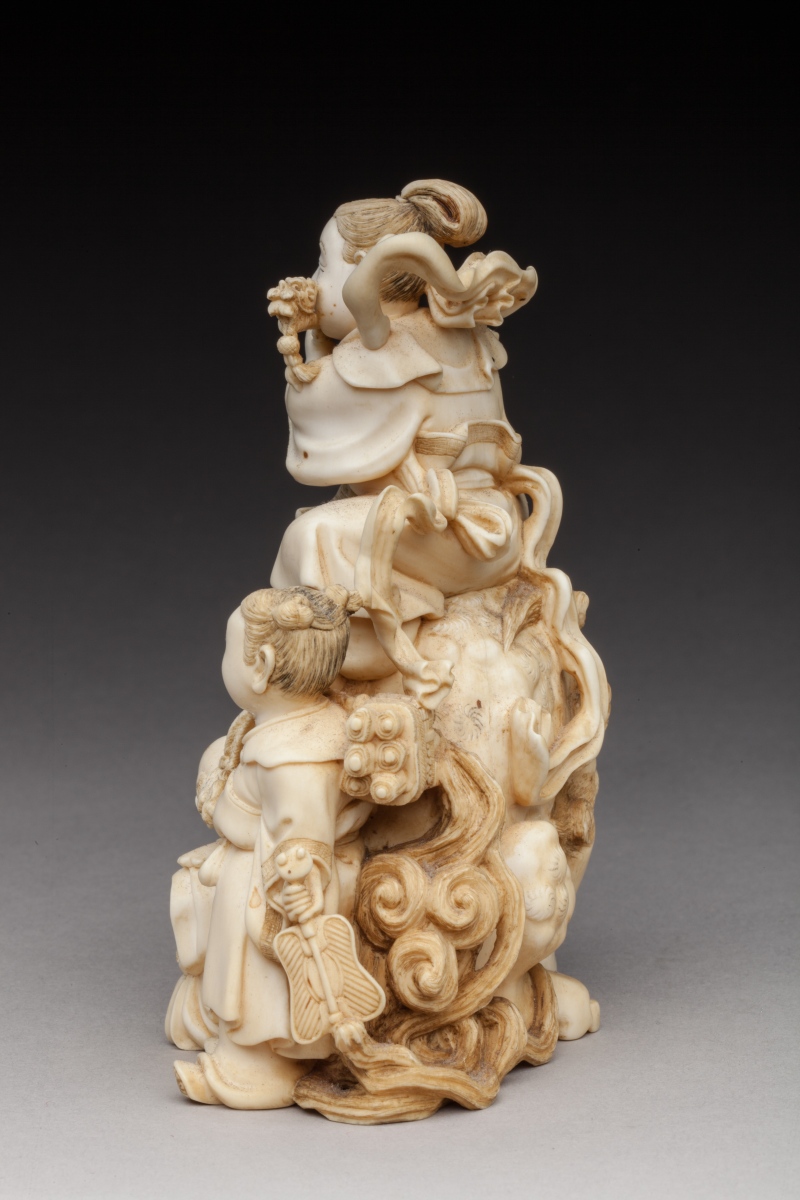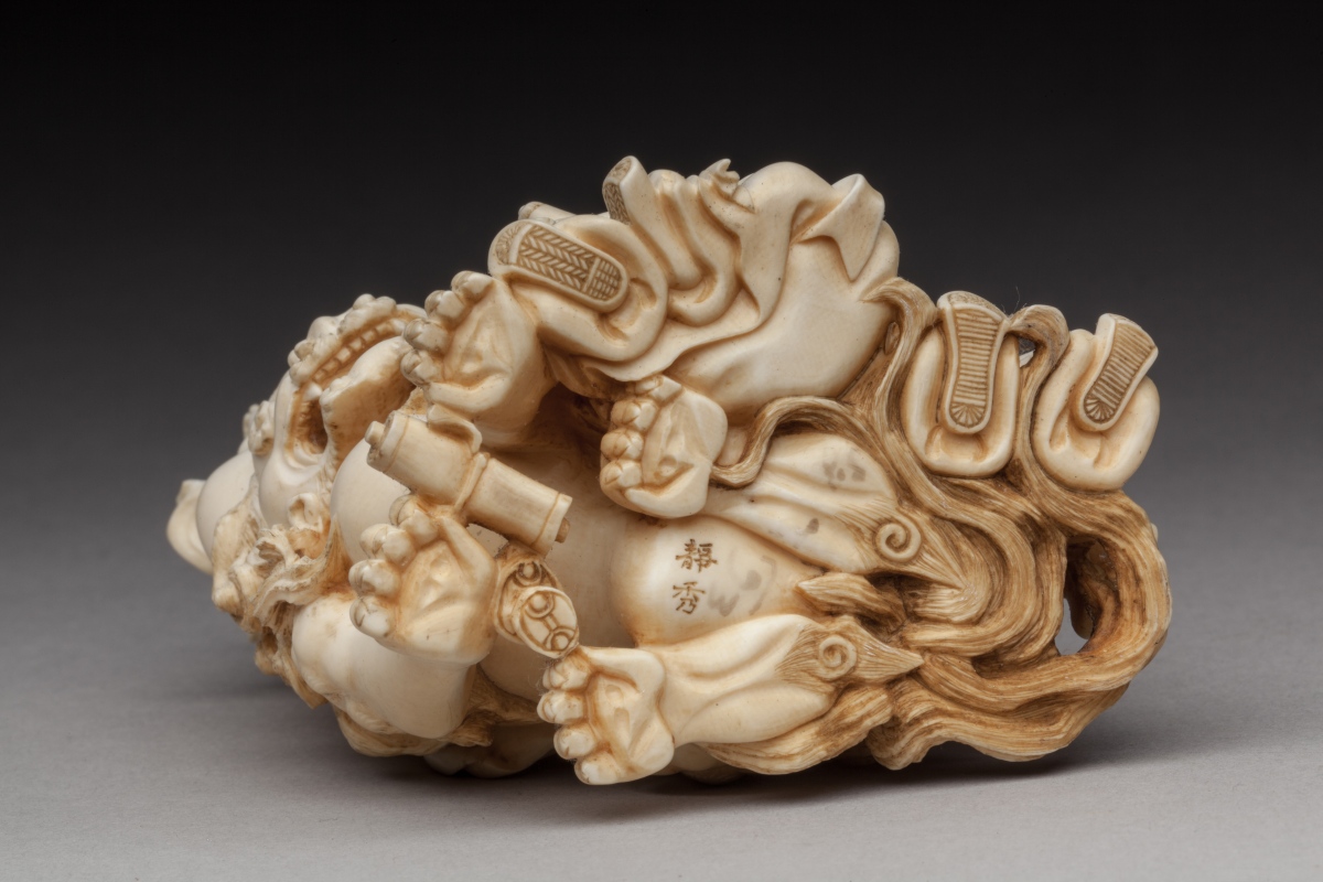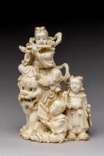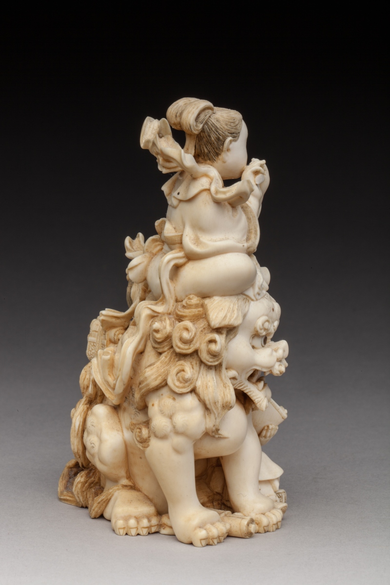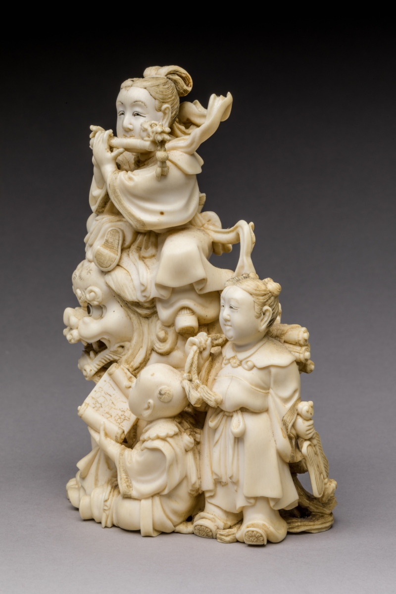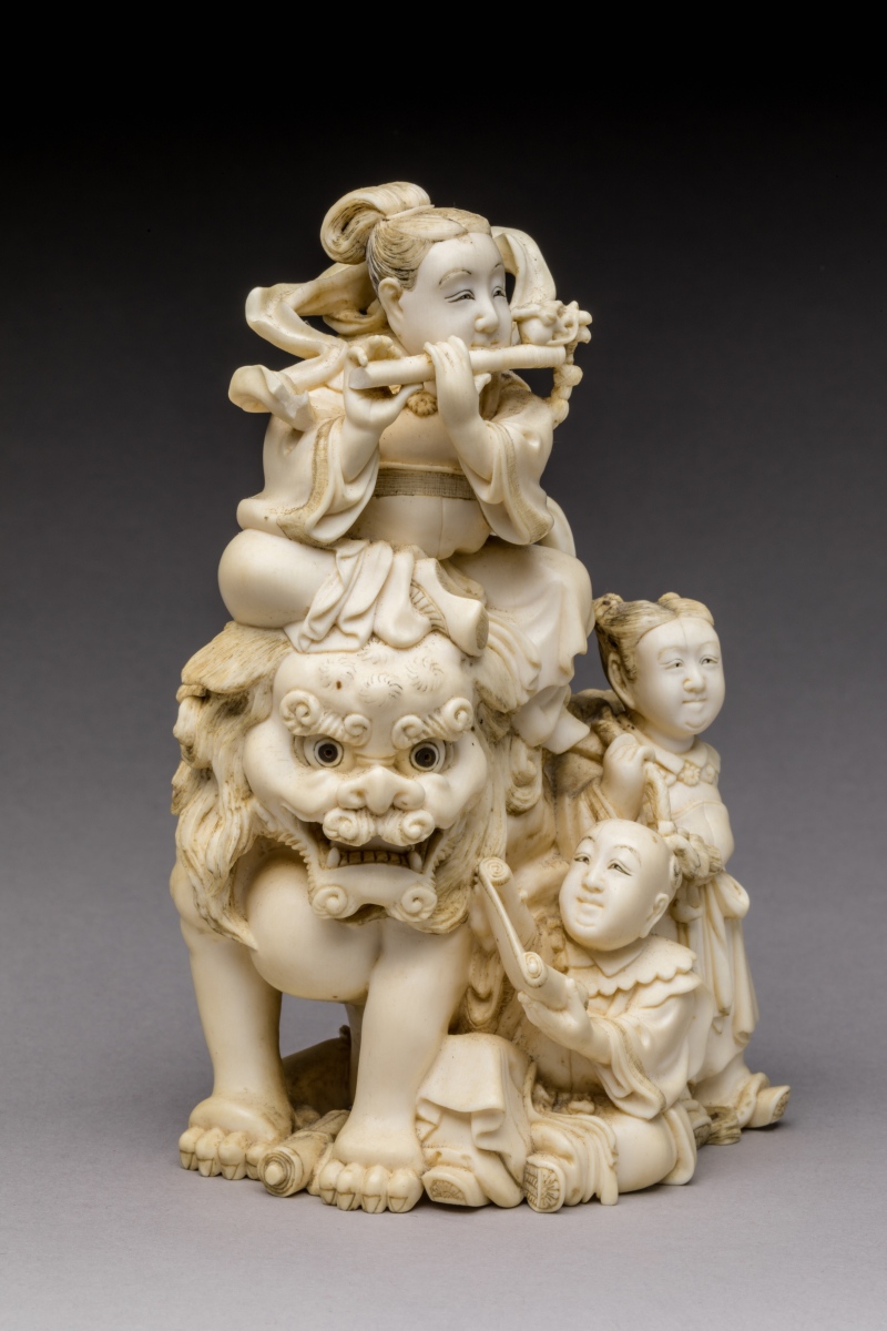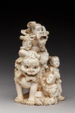 JAPAN, MEIJI period. Ivory OKIMONO depicting three children with a chimaera. Signed Seiki.