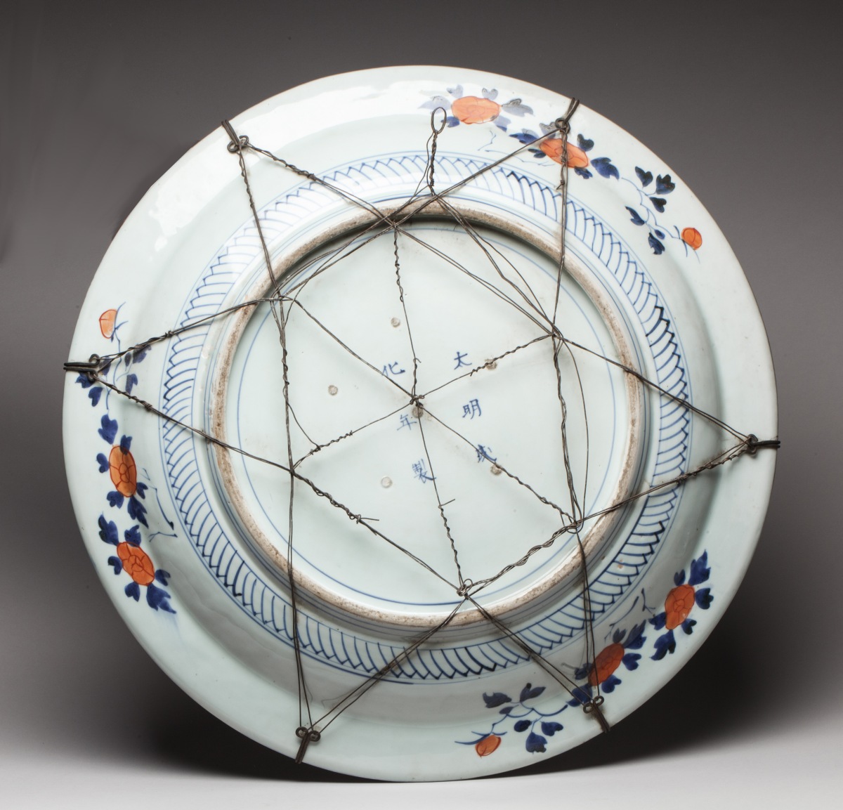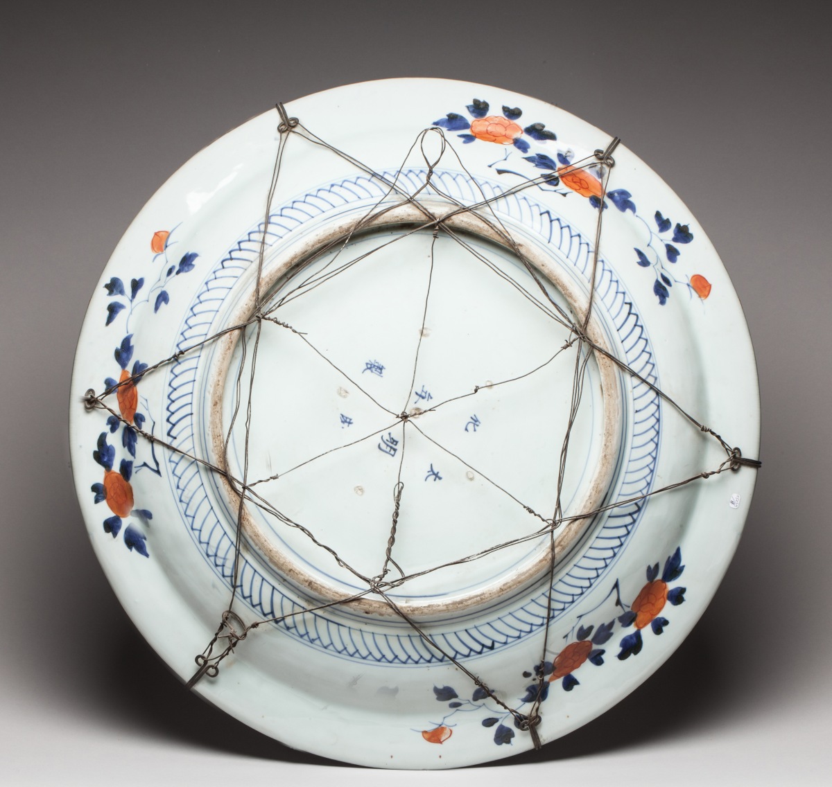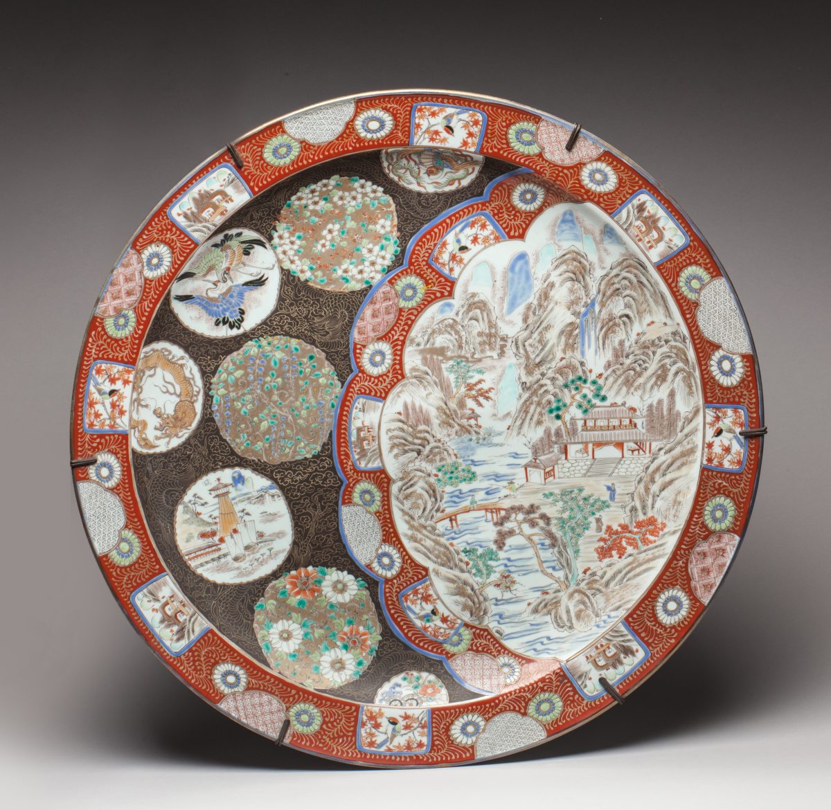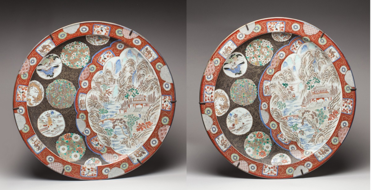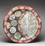 JAPAN, 18th - 19th centuries. A pair of large polychrome porcelain DISHES with gold enamels depicting landscapes, fantastic beasts and flowers.