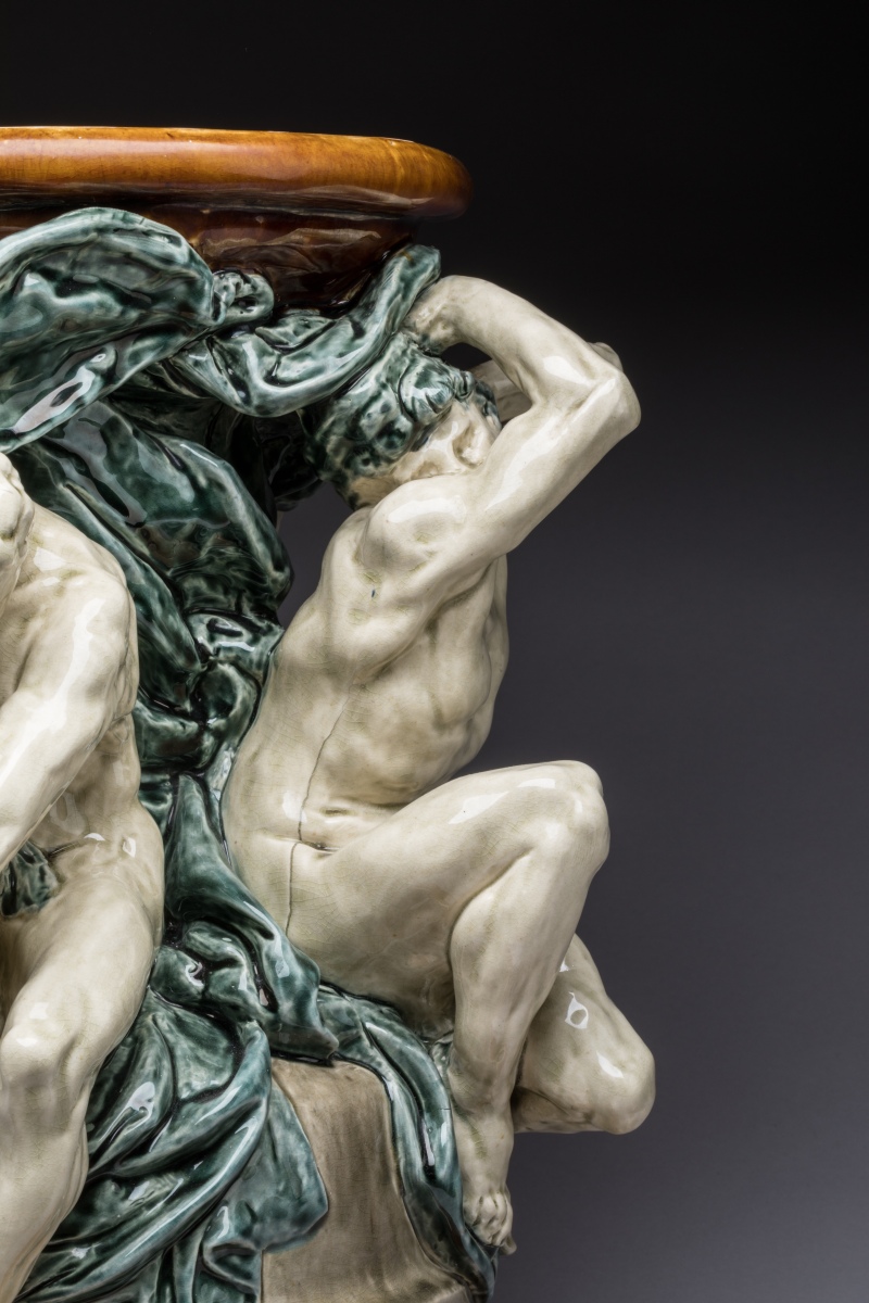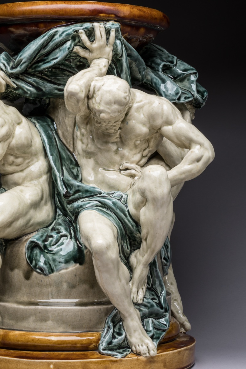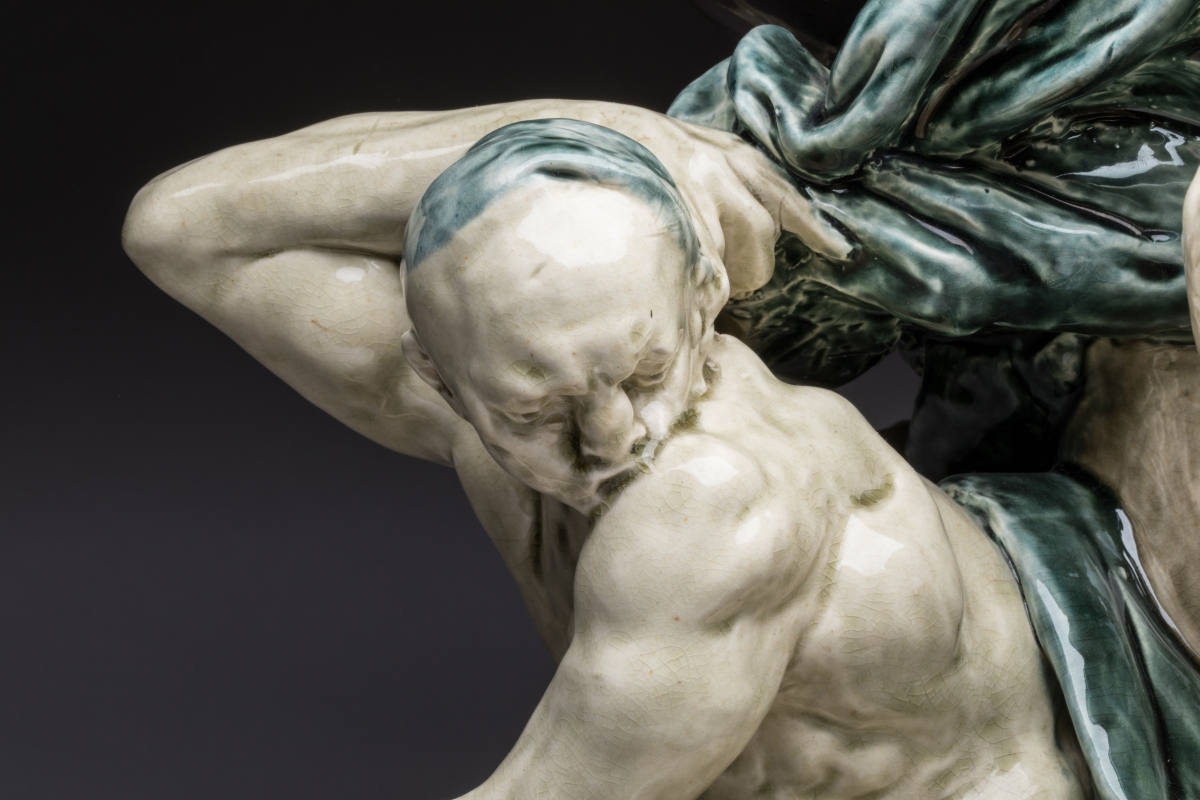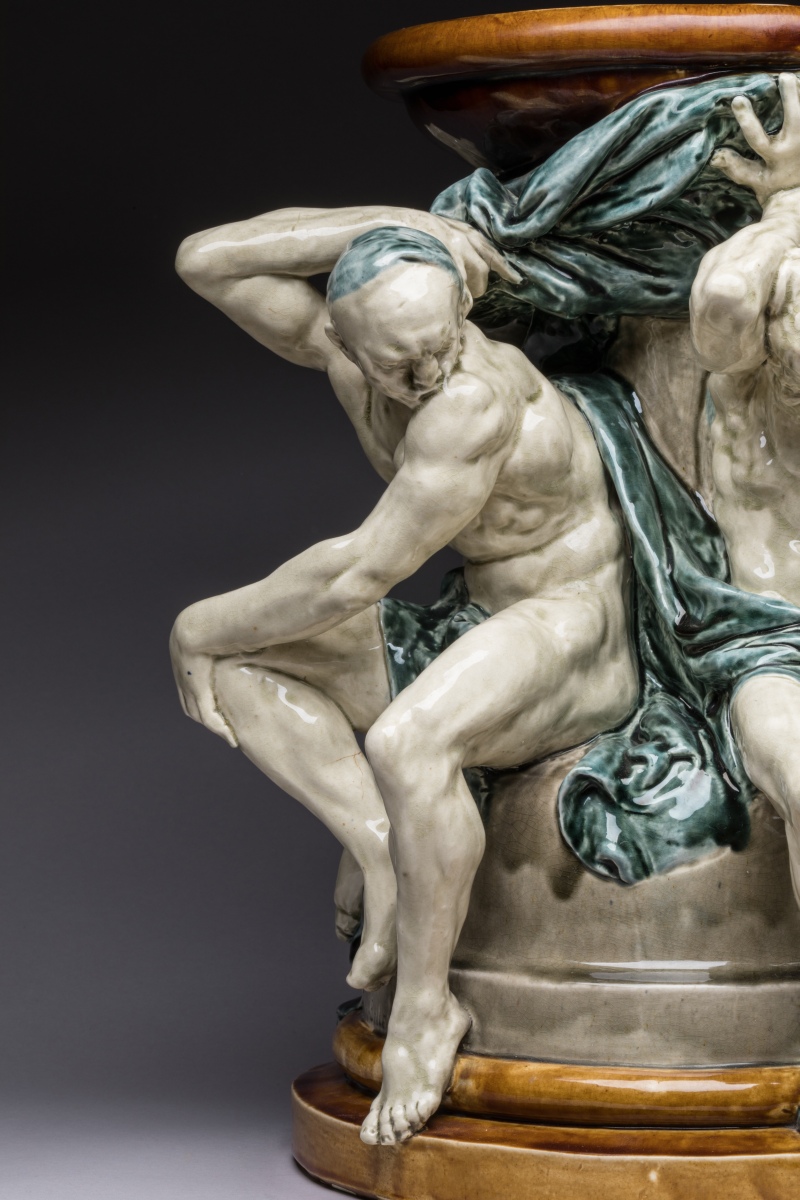 Piétement composé de quatre titans en relief en faïence émaillée.