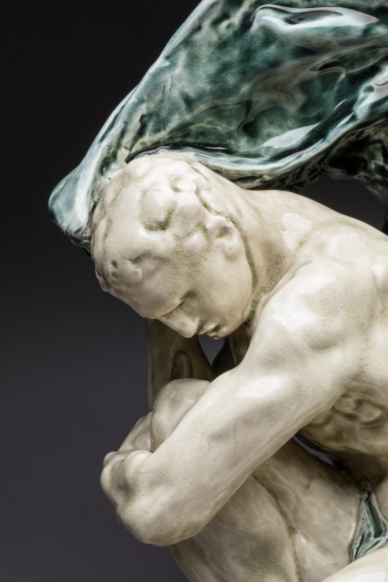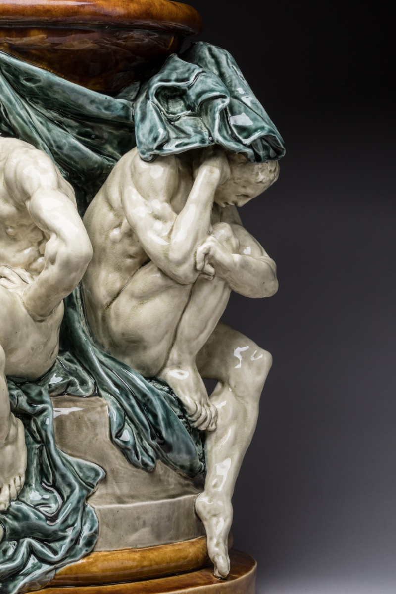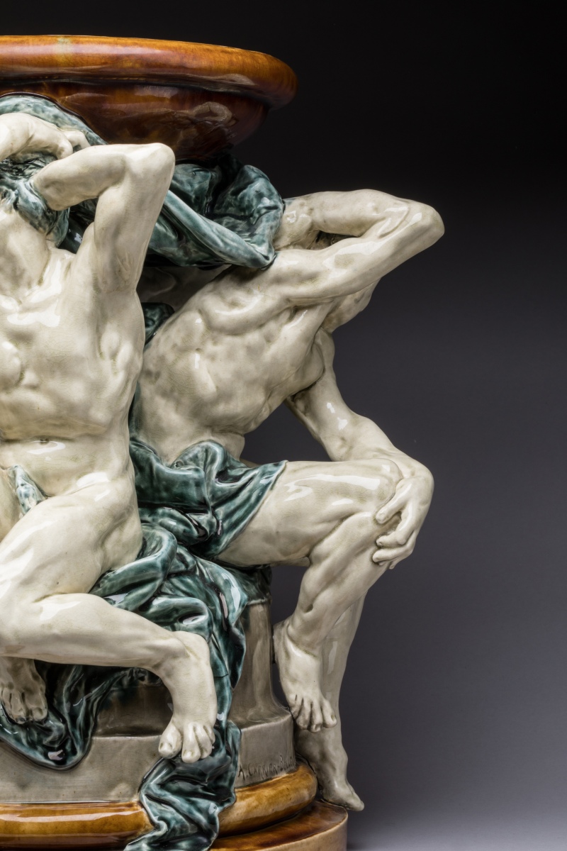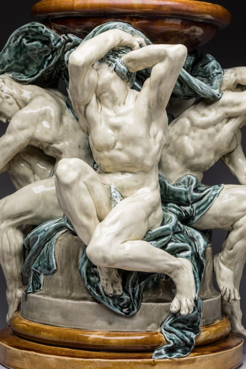 Piétement composé de quatre titans en relief en faïence émaillée.