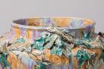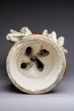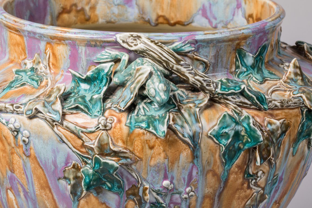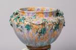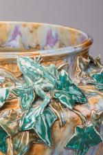 La vasque en faïence émaillée à décor en applique de feuillages et grenouilles.