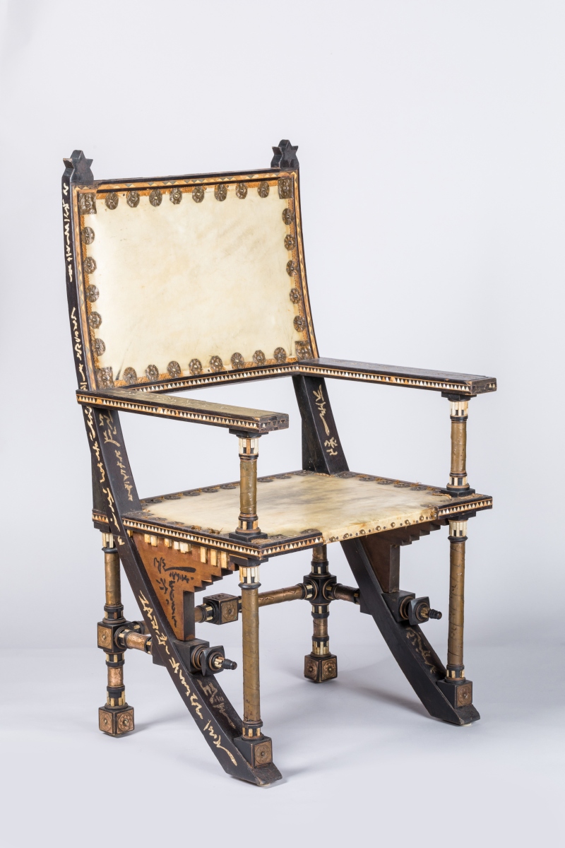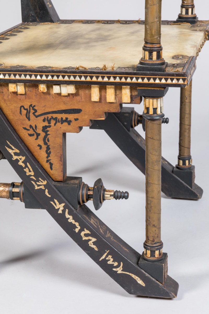 Carlo BUGATTI. A natural and blackened wood ARMCHAIR with embossed copper and mother-of-pearl inlaids. Provenance: collected by the current owner on a curb in Sologne.