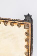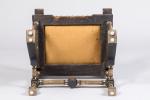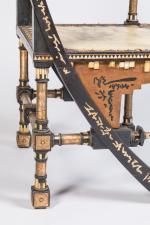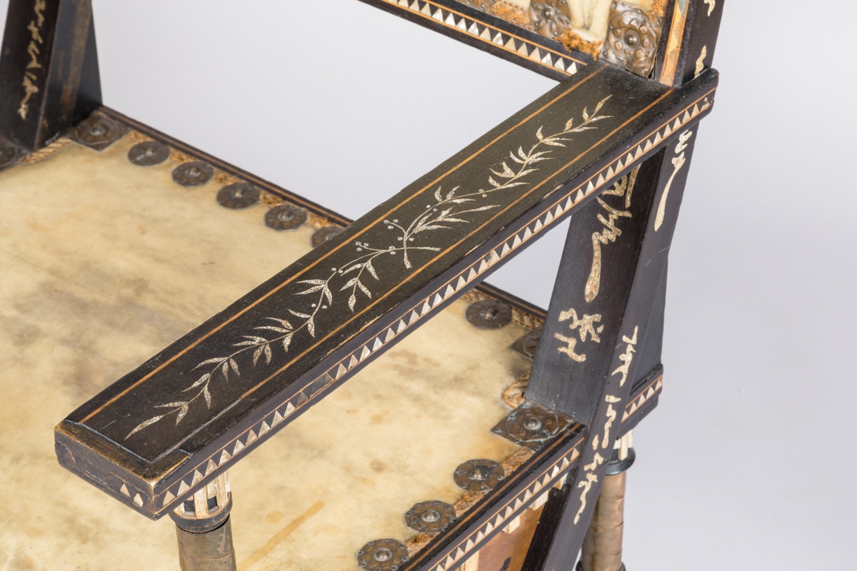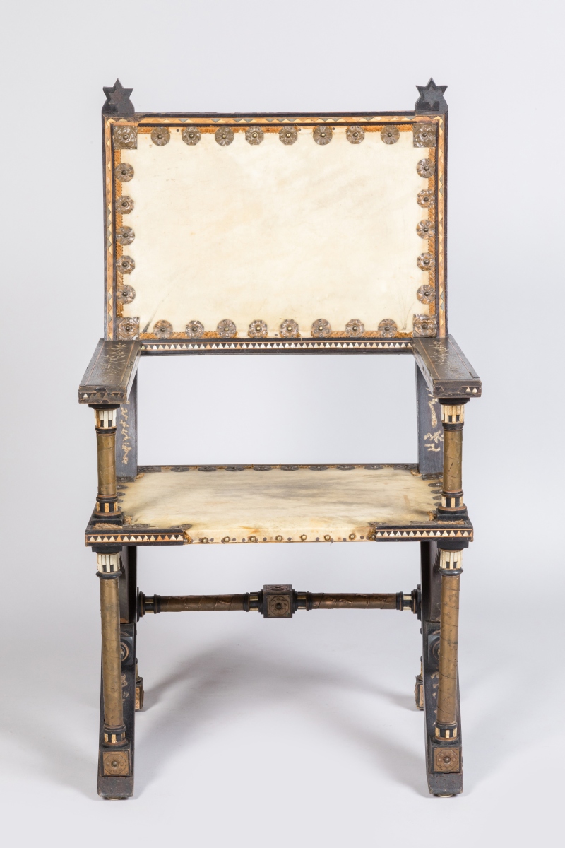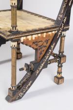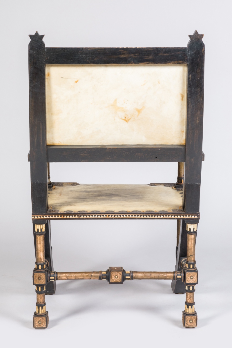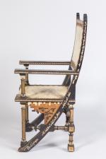 Fauteuil au dossier et à l'assise rectangulaires, gainés de parchemin et ceinturés de motifs circulaires en cuivre. Montants en bois teinté noir et piètement en compas à incrustations de motifs graphiques en nacre et ornementations de cuivre repoussé.