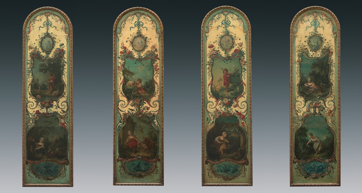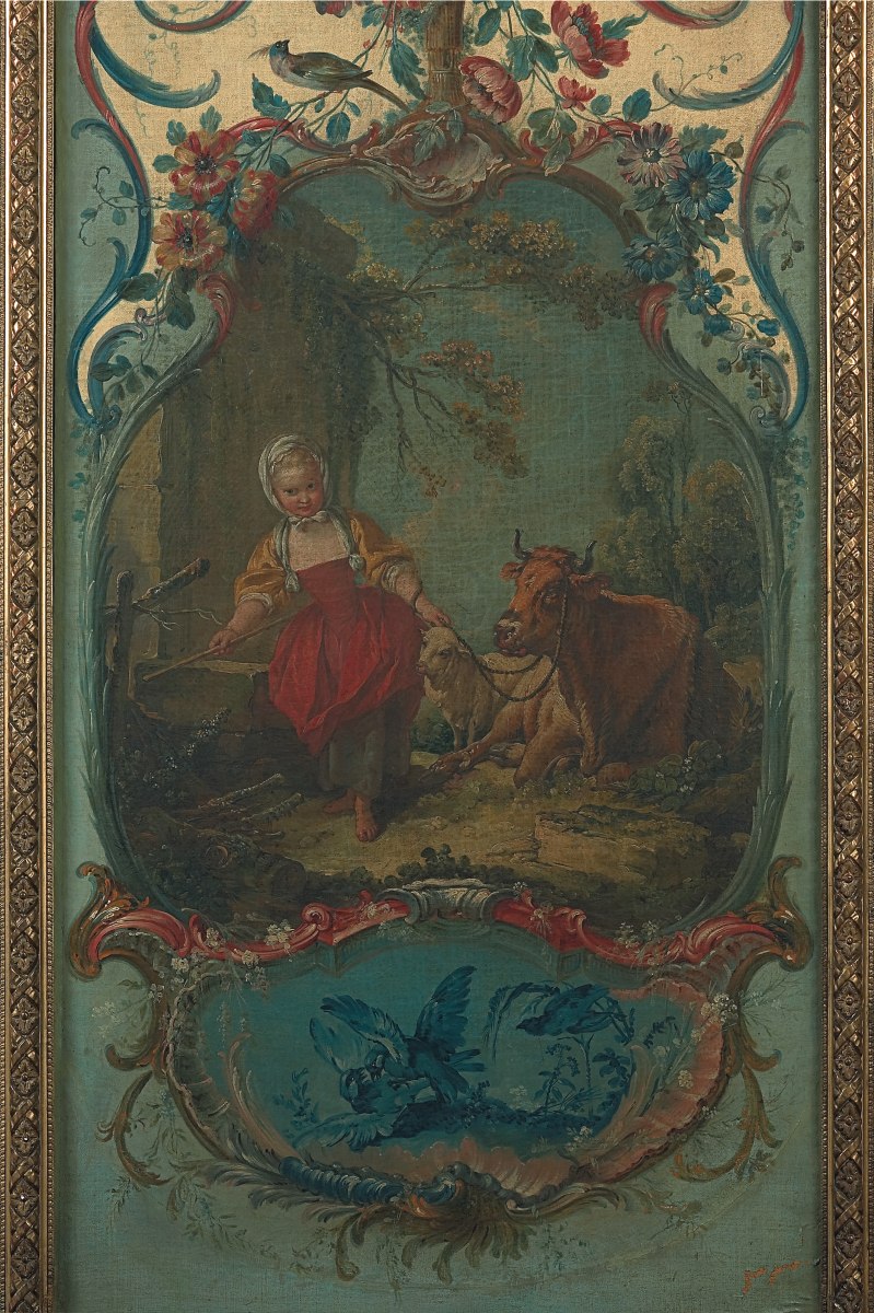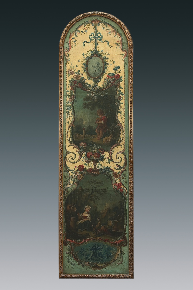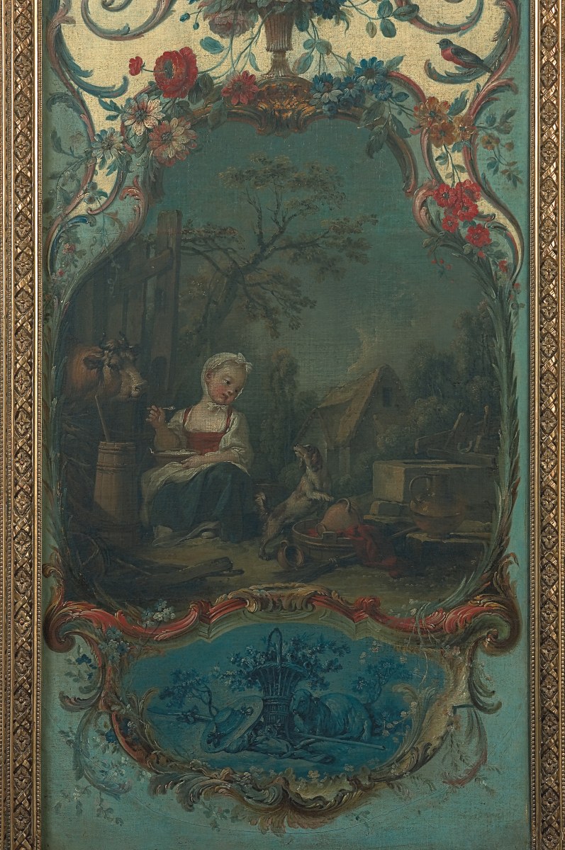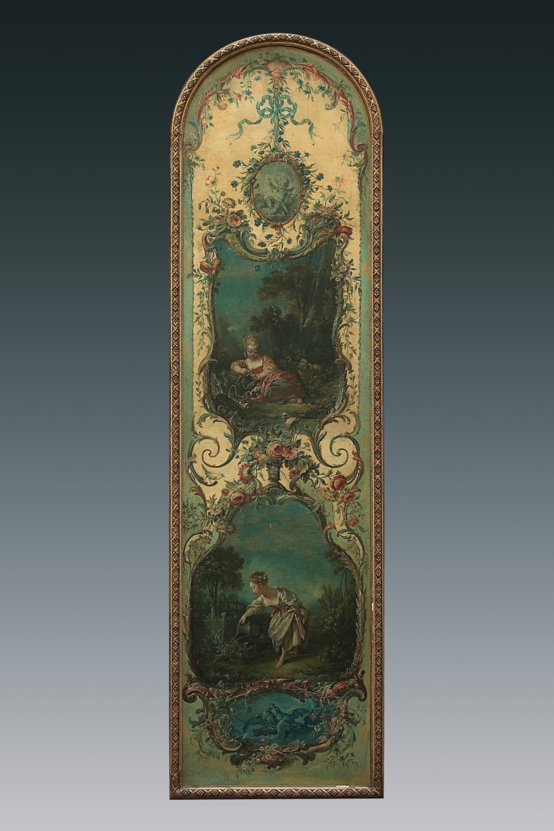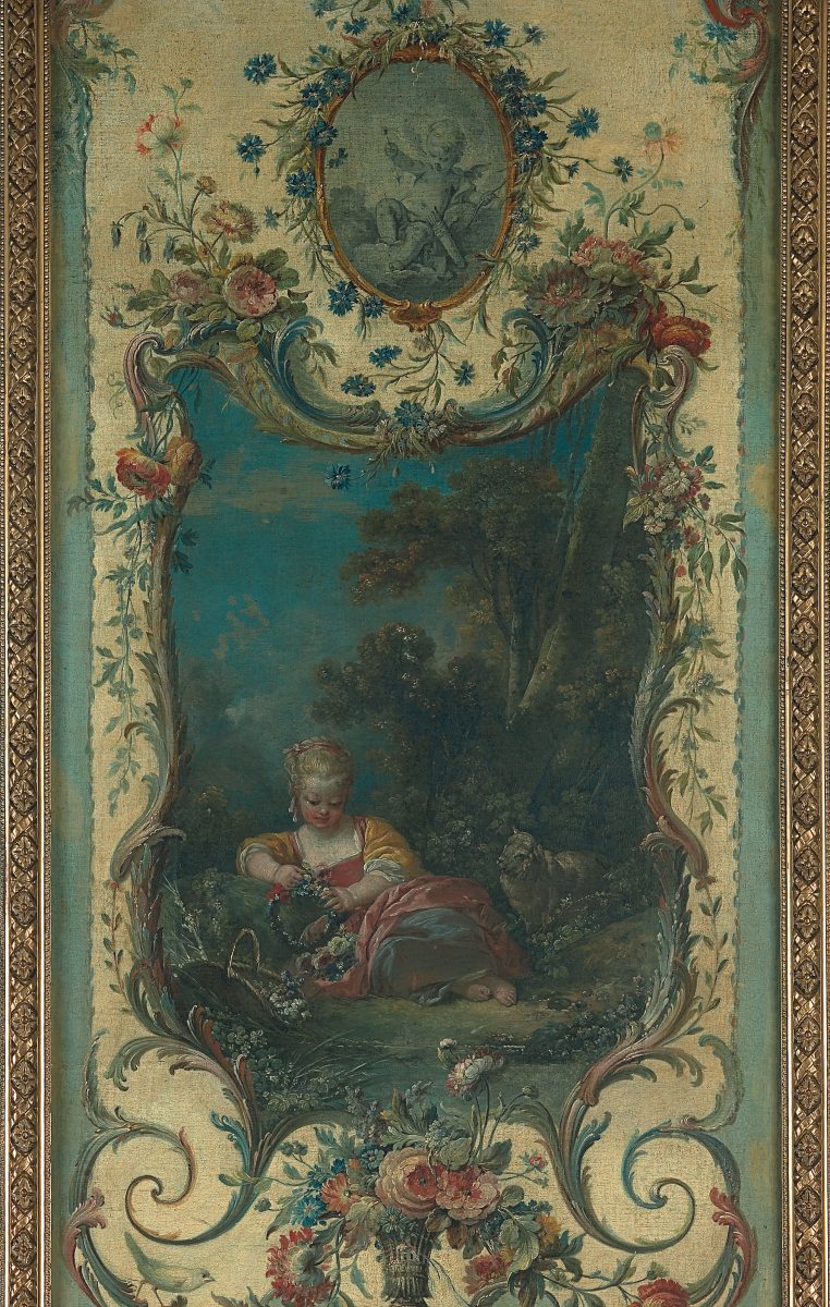 François BOUCHER, Pastoral scenes with rocaille ornaments, four canvases. Delivered to the Marquise de Pompadour for her castle of Crécy, 1751. Thence bought by the Duc de Penthièvre for his castle of Sceaux before 1769, and sold during the Revolution. Eventually acquired by the Duc de Trevise for his castle of Sceaux in a sale at the Hôtel Drouot, Paris, 1872.