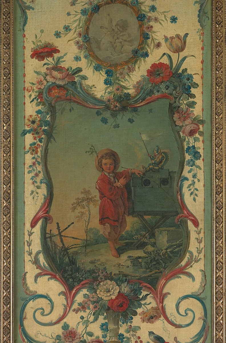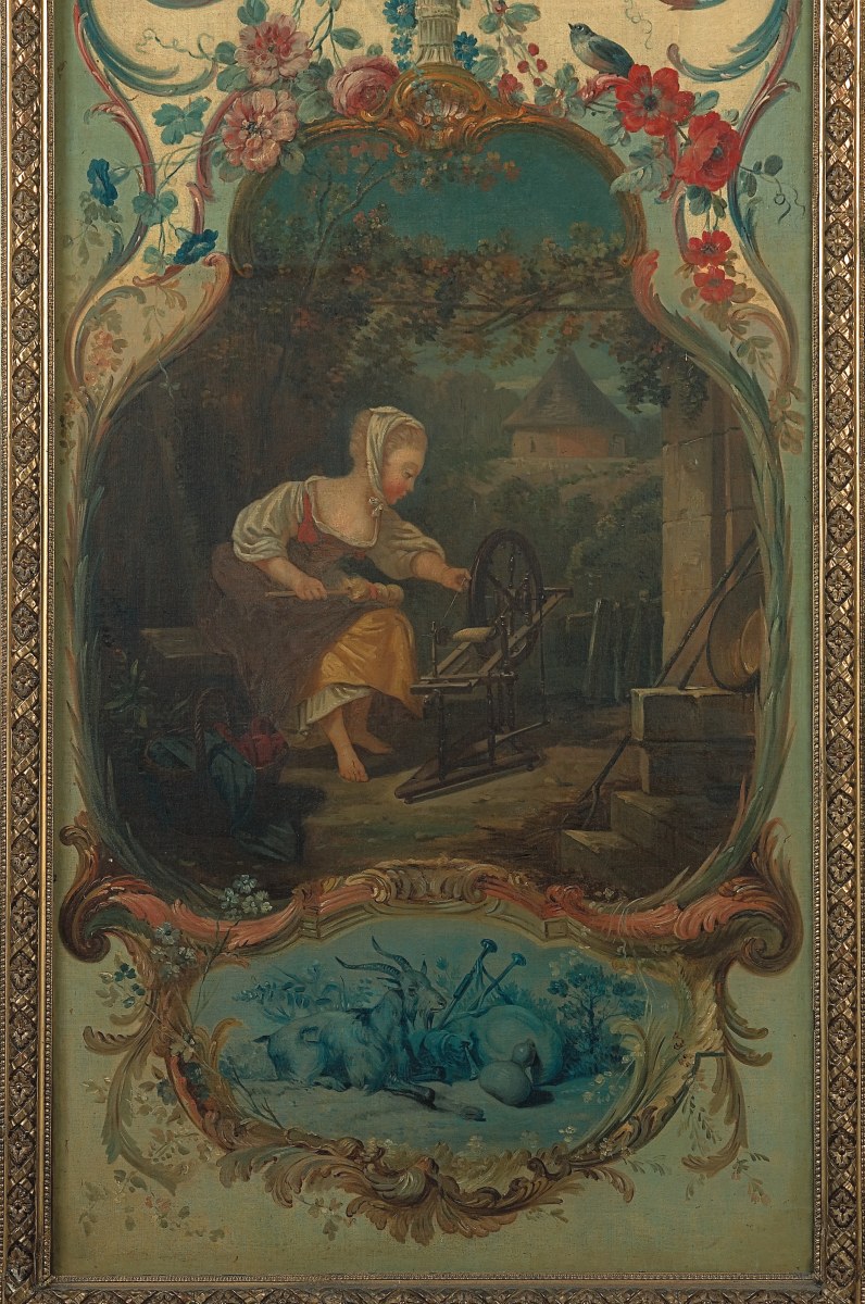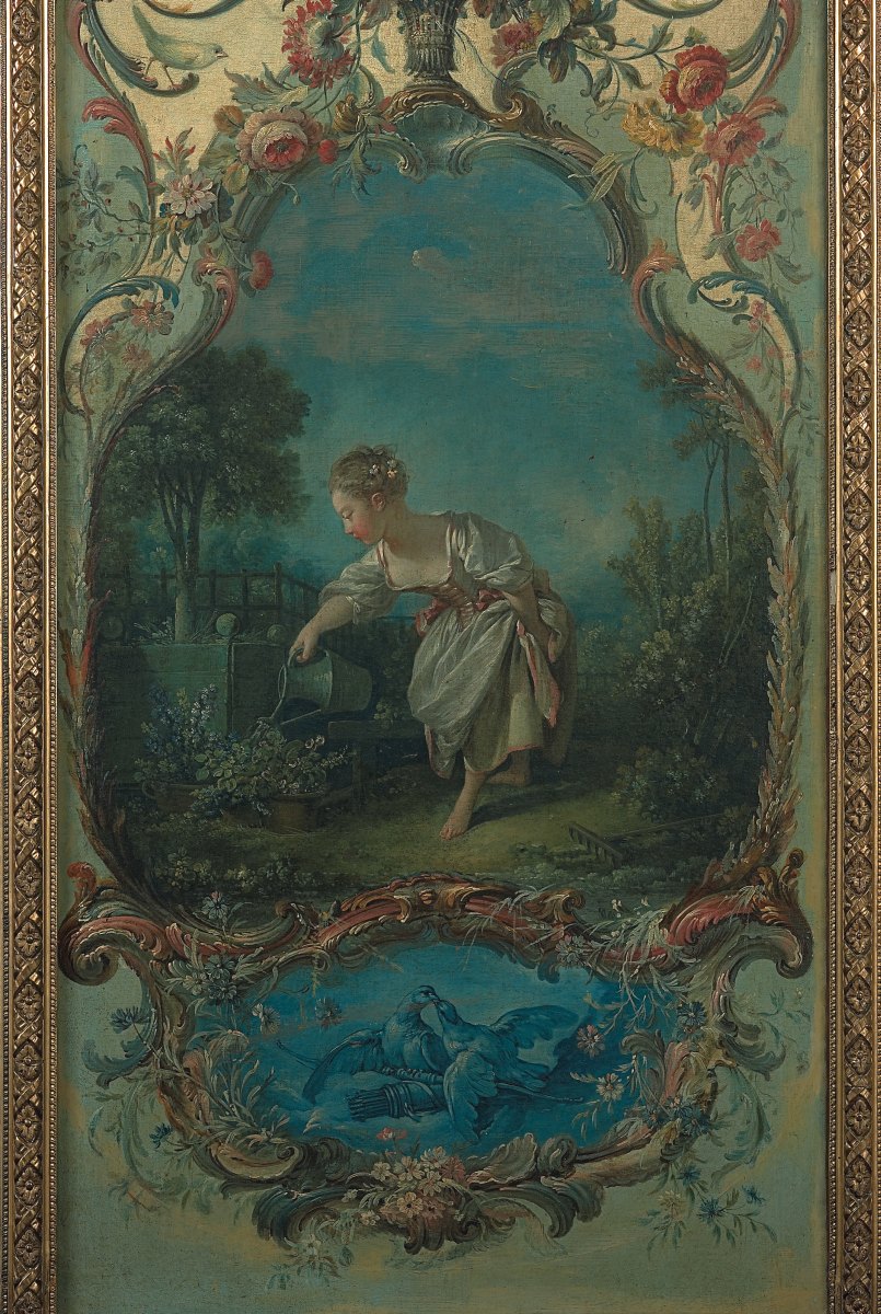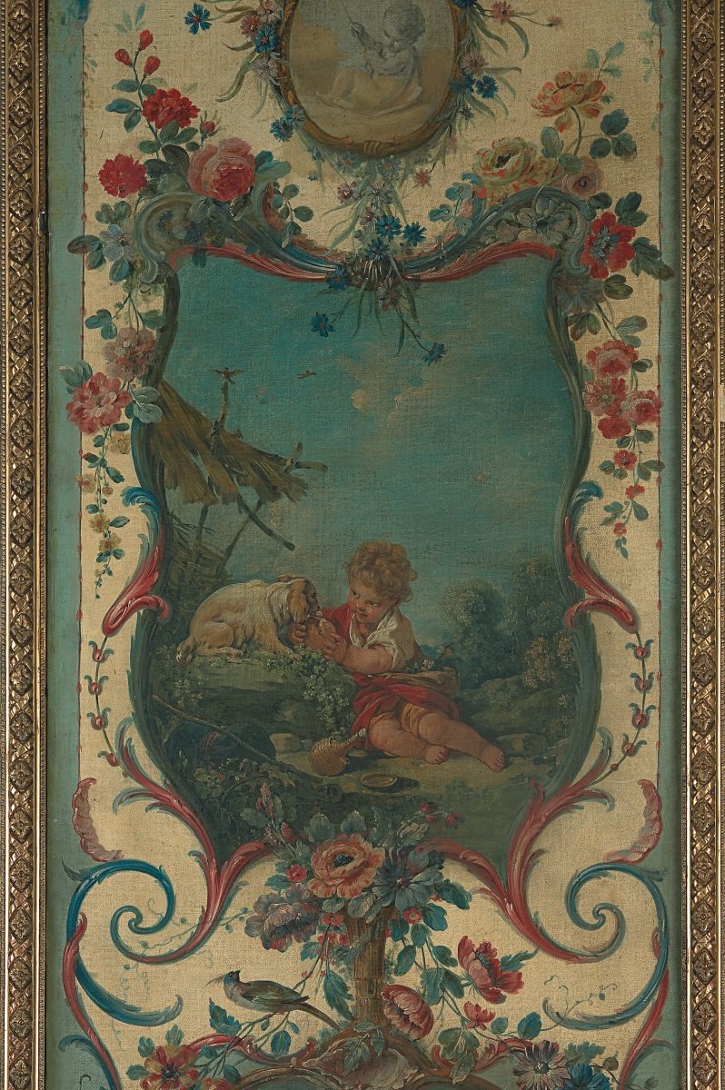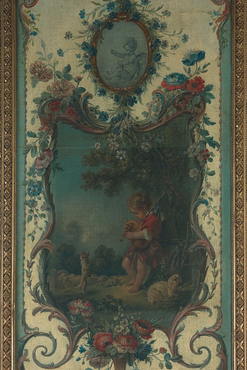 François BOUCHER, Pastoral scenes with rocaille ornaments, four canvases. Delivered to the Marquise de Pompadour for her castle of Crécy, 1751. Thence bought by the Duc de Penthièvre for his castle of Sceaux before 1769, and sold during the Revolution. Eventually acquired by the Duc de Trevise for his castle of Sceaux in a sale at the Hôtel Drouot, Paris, 1872.