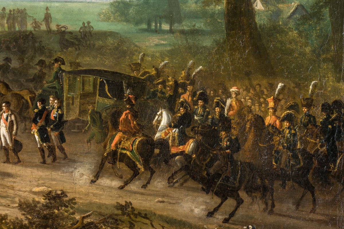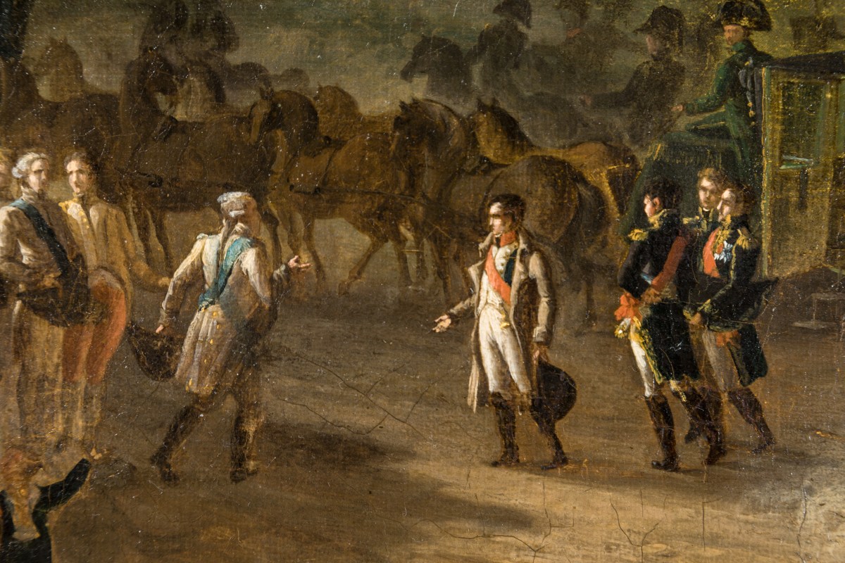 Notre tableau est à rapprocher de la composition de Louis Etienne Watelet, Napoléon Ier reçu au château de Ludwigsburg par Frédéric II, duc de Würtemberg, conservée à Versailles au musée du Château et de Trianon (inv. 8520, toile de 225 x 188 cm).