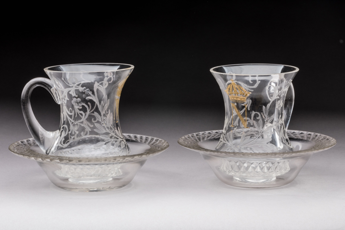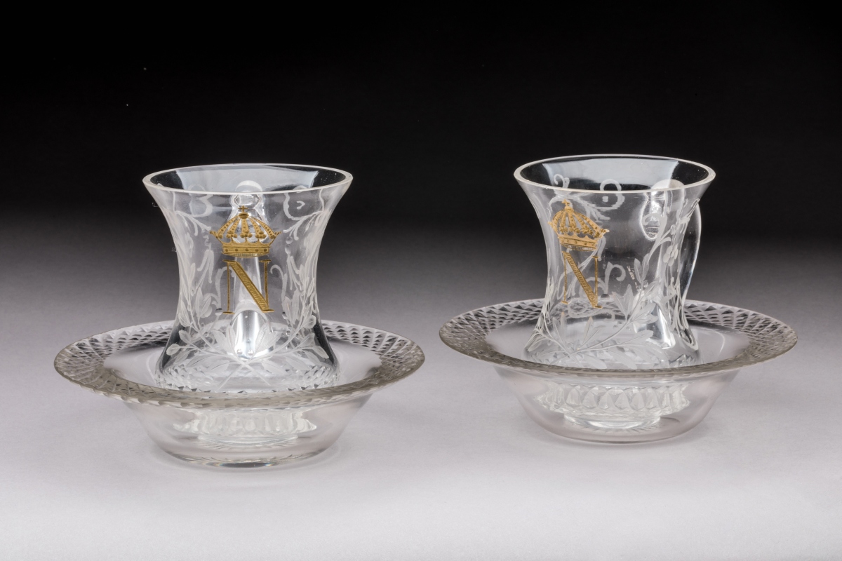 Manufacture de S. M. l'Impératrice des Cristaux du Montcenis. A pair of mouth-blown crystal SHERBET CUPS and SAUCERS from the service of Napoleon Ier.