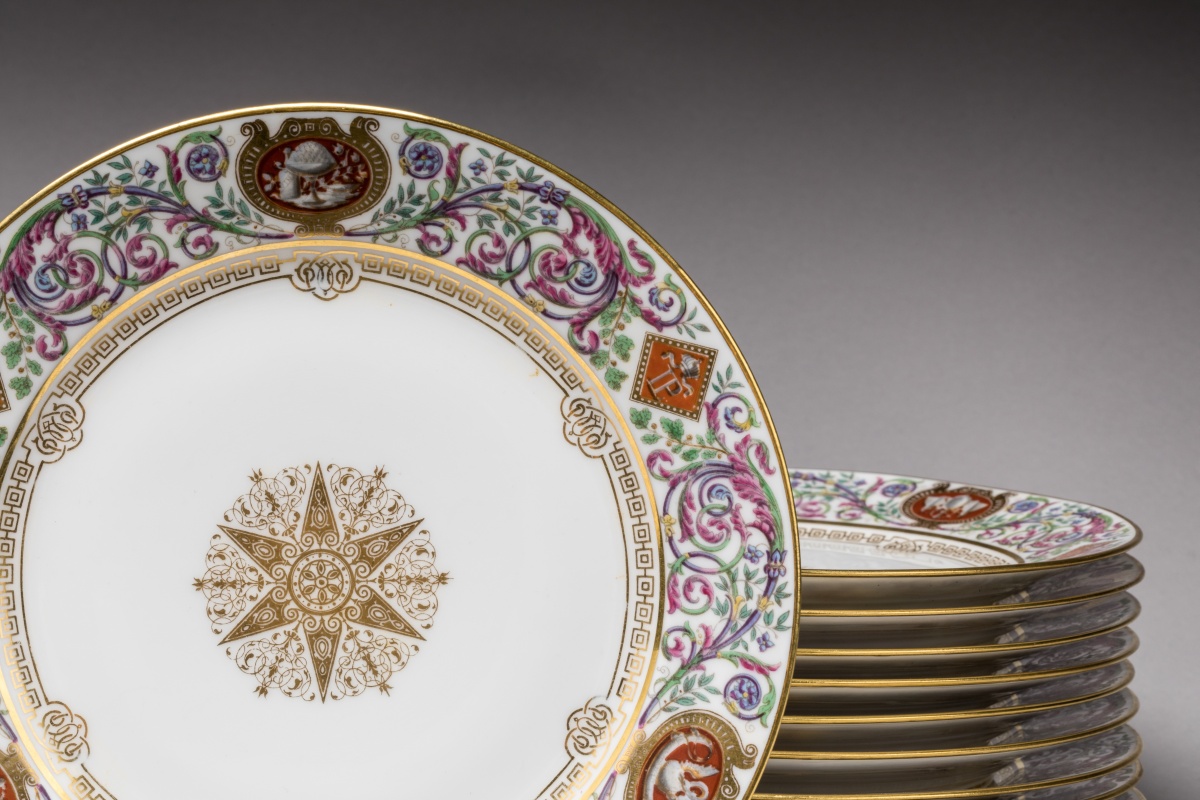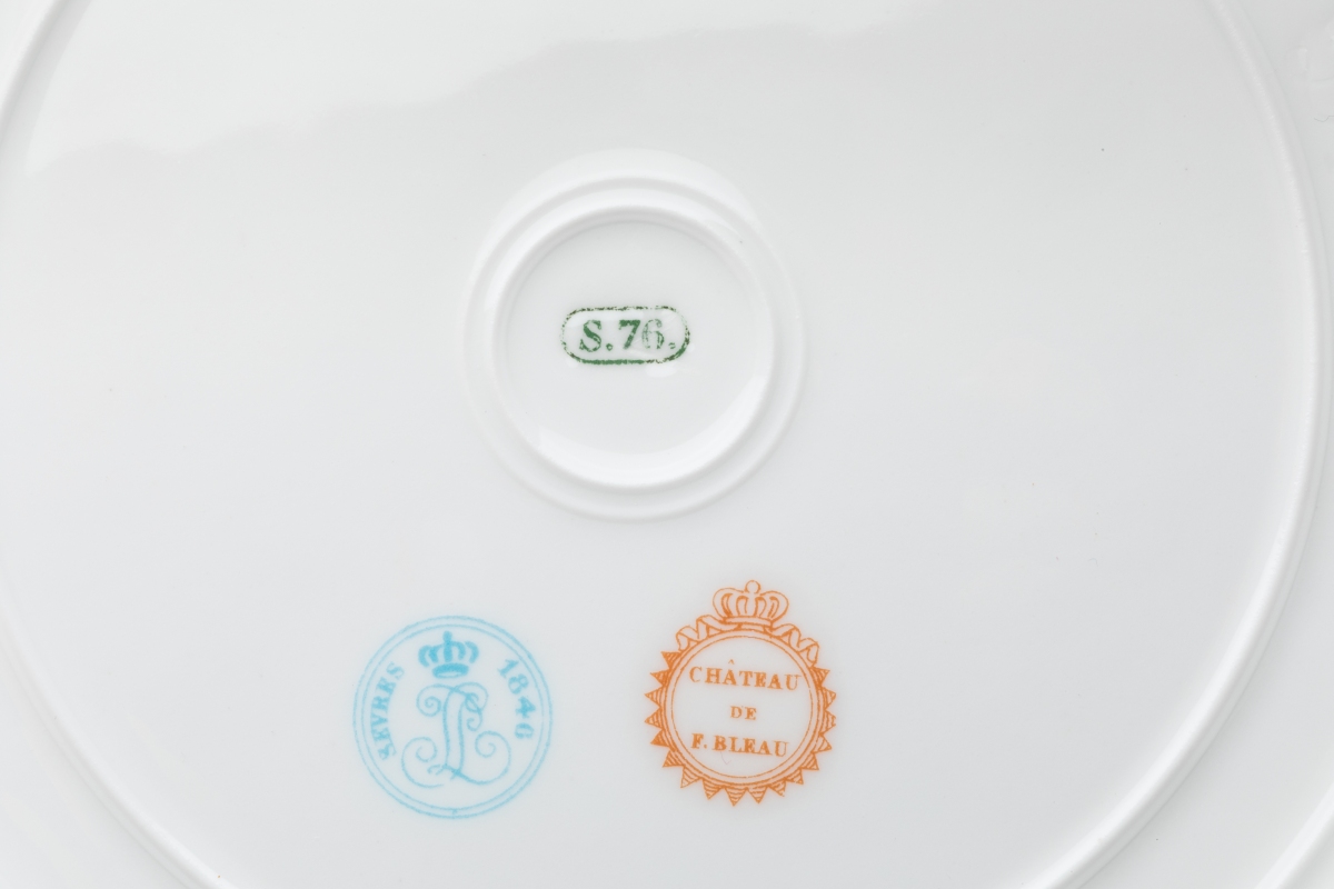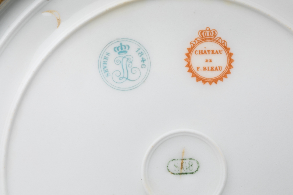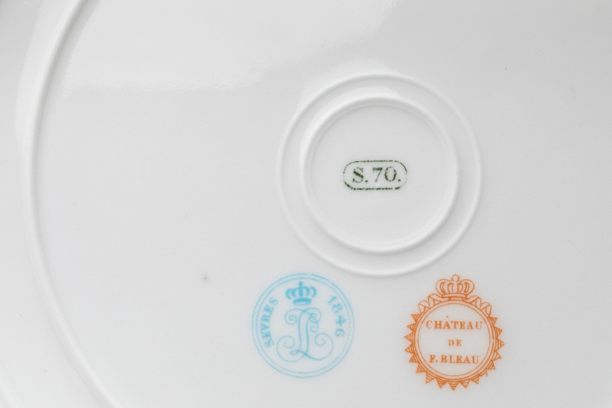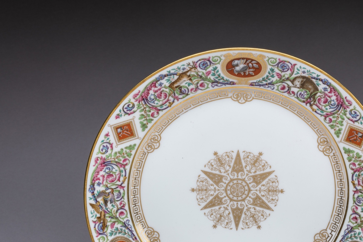 SÈVRES. A part of the SERVICE des CHASSES for the KING LOUIS-PHILIPPE, castle of FONTAINEBLEAU. Comprises 10 dinner plates and 11 dessert plates. Marked and dated from 1846 to 1876.