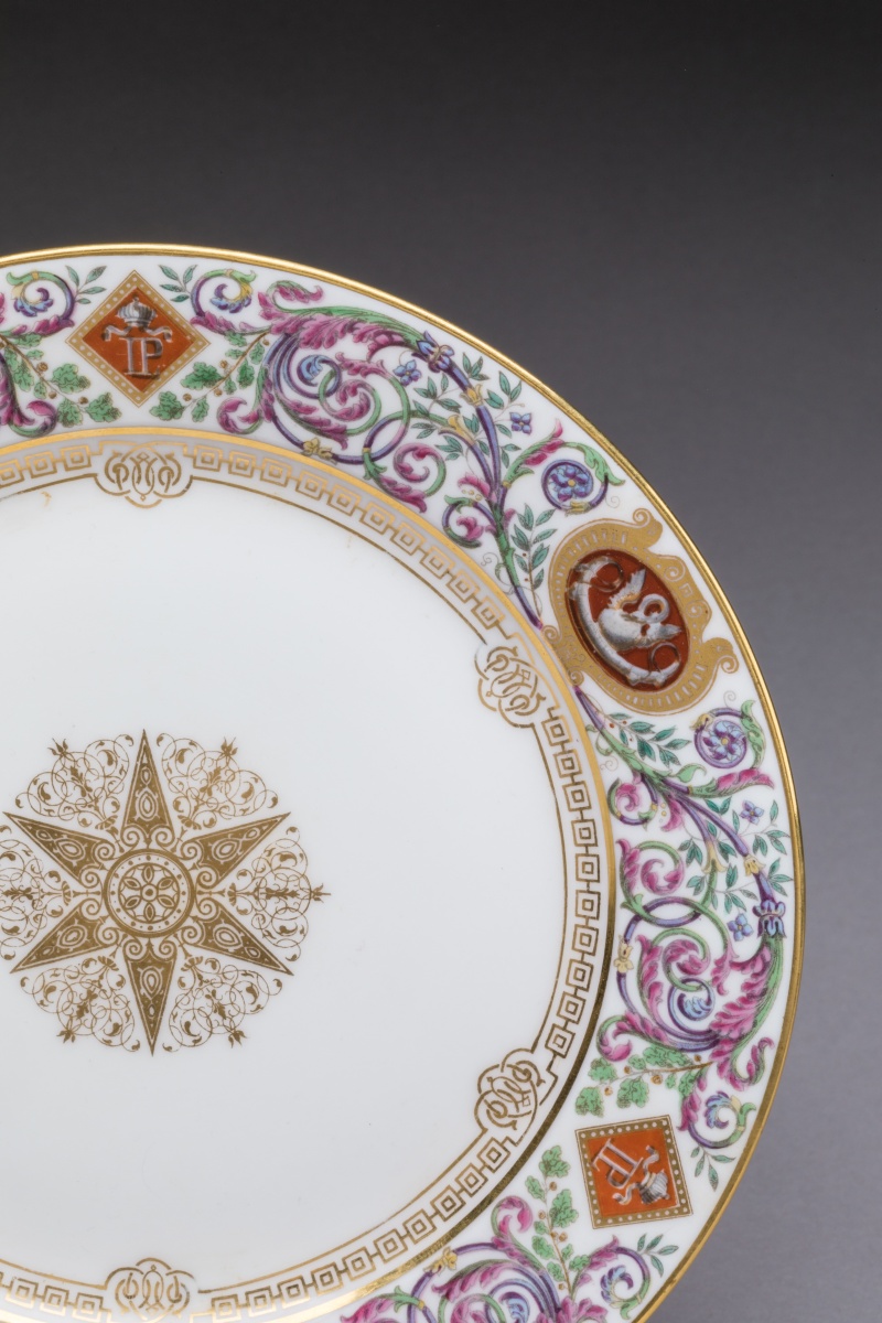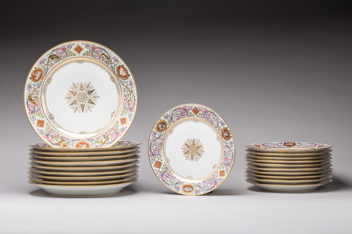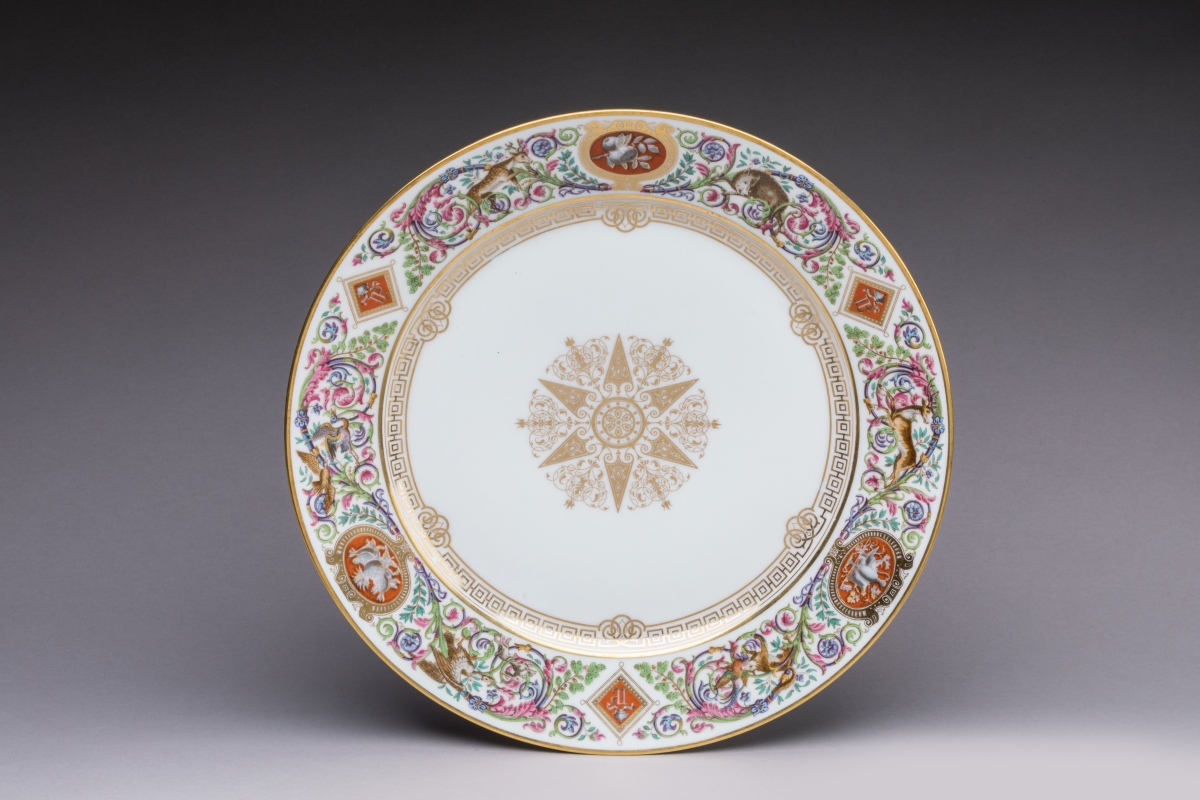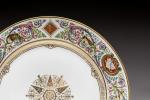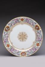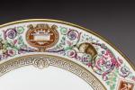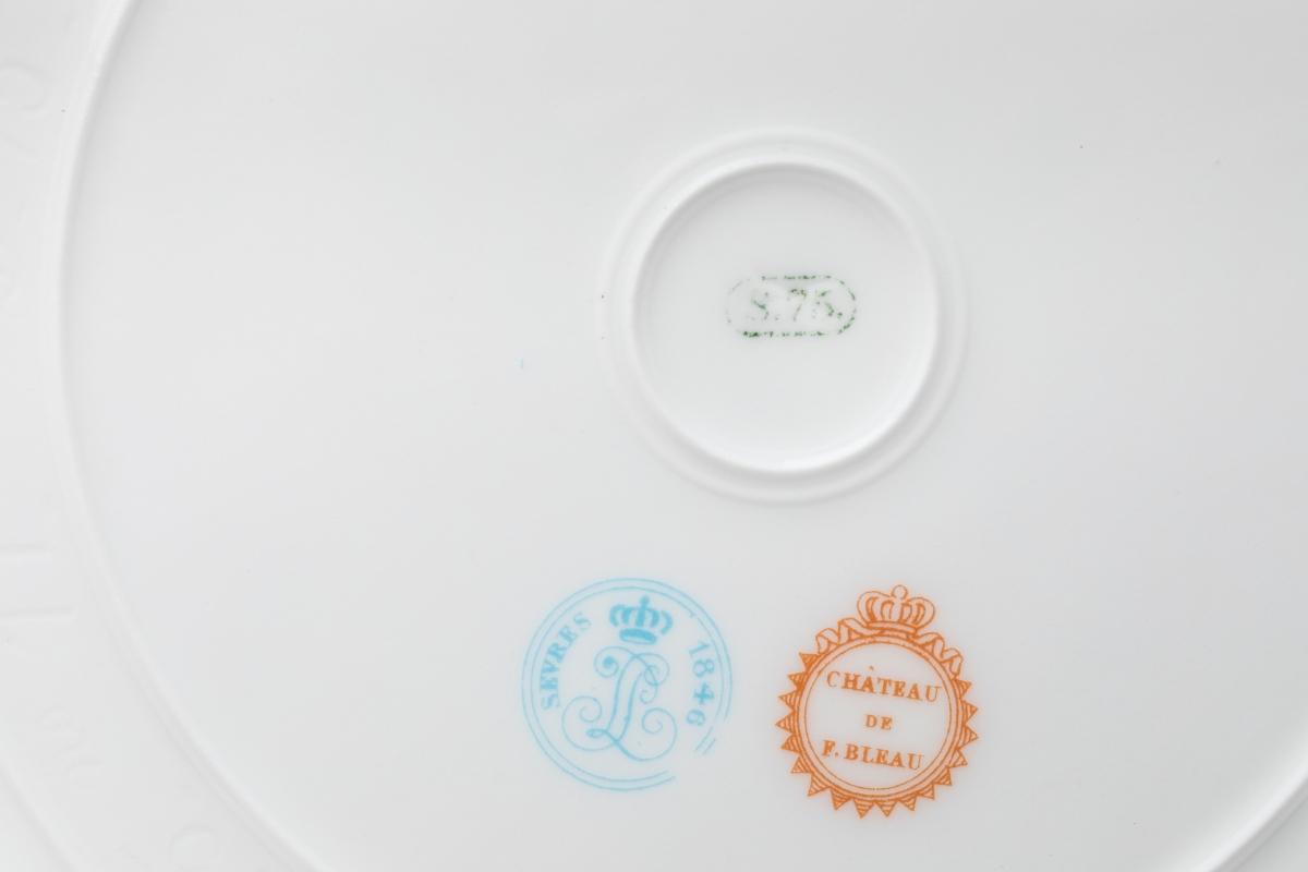 SÈVRES. A part of the SERVICE des CHASSES for the KING LOUIS-PHILIPPE, castle of FONTAINEBLEAU. Comprises 10 dinner plates and 11 dessert plates. Marked and dated from 1846 to 1876.