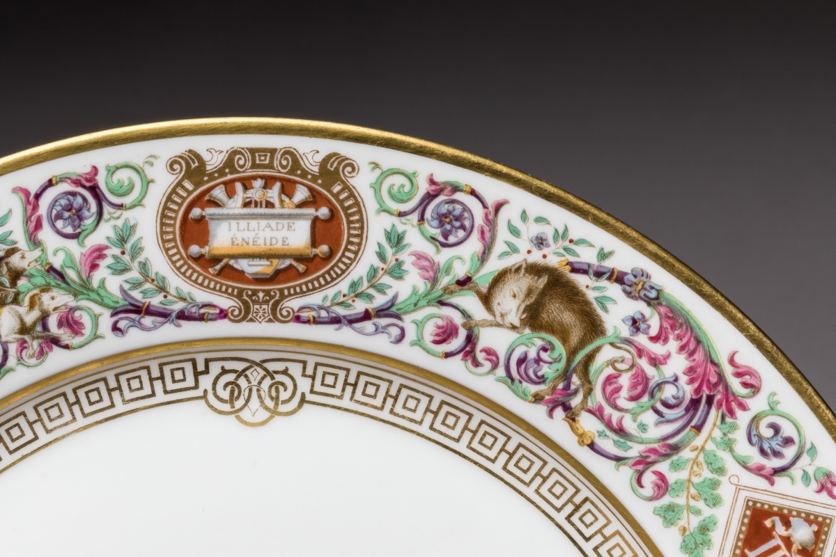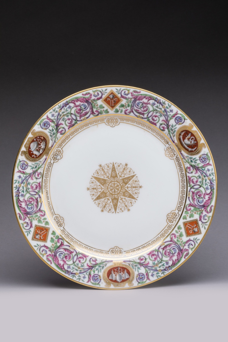 Elle se compose de DIX GRANDES ASSIETTES et de ONZE ASSIETTES à DESSERT. L'aile reçoit un riche décor polychrome imprimé et rehaussé or de rinceaux encadrant six cartouches en grisaille sur fond brique à la façon des camées. Ils sont ornés en grisaille d'attributs cynégétiques, poétiques, musicaux, de fruits ou de natures mortes, en alternance avec le chiffre de Louis-Philippe timbré de la couronne royale. Le bassin est centré d'un fleuron or et le marli d'une frise or. Les grandes assiettes présentent des scènes de chasse et animaux sauvages au naturel évoluant au travers des rinceaux.
