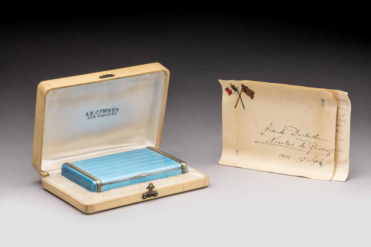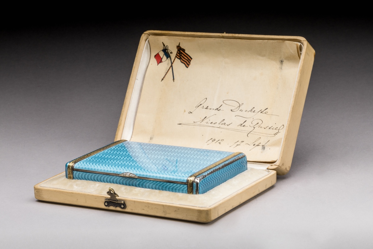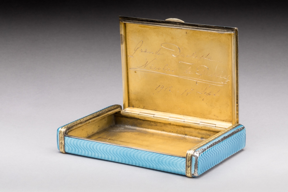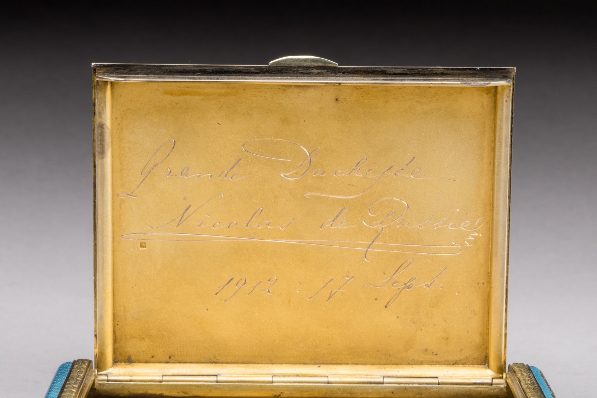 L'intérieur du couvercle gravé au stylet : "Grande Duchesse / Nicolas de Russie / 1912. 17 Sept."