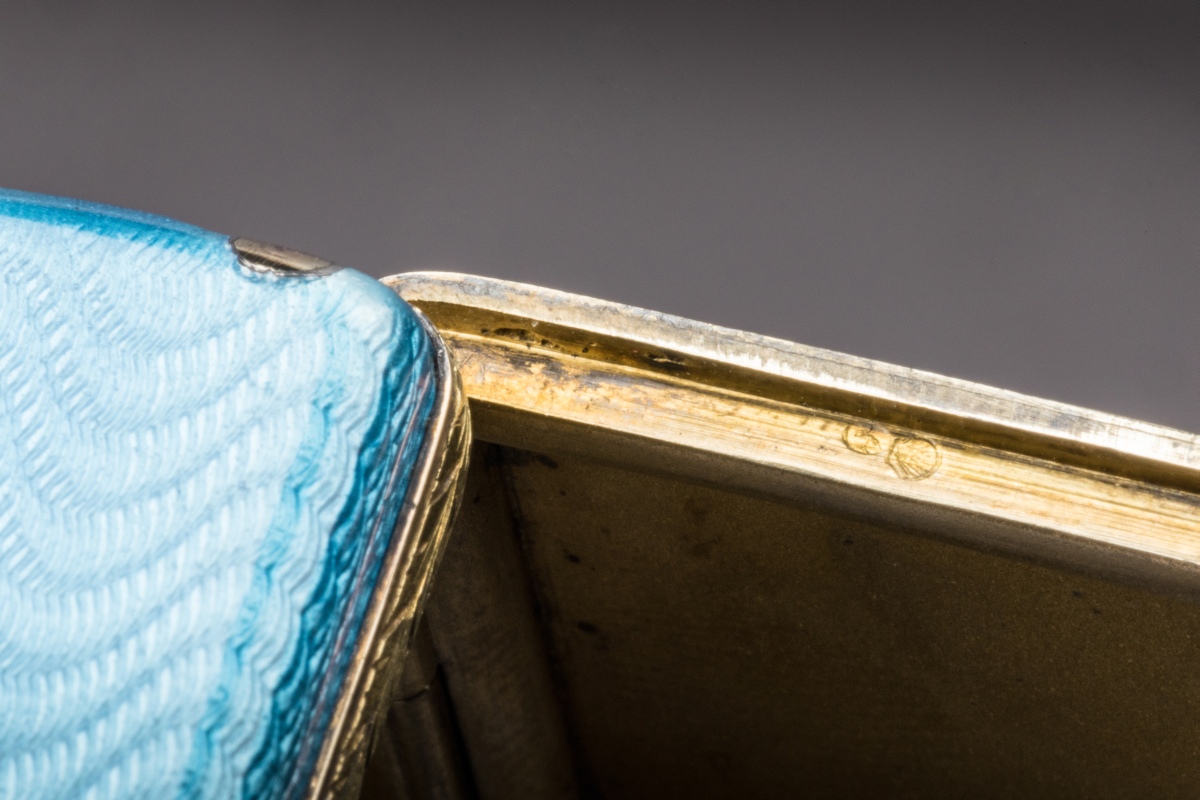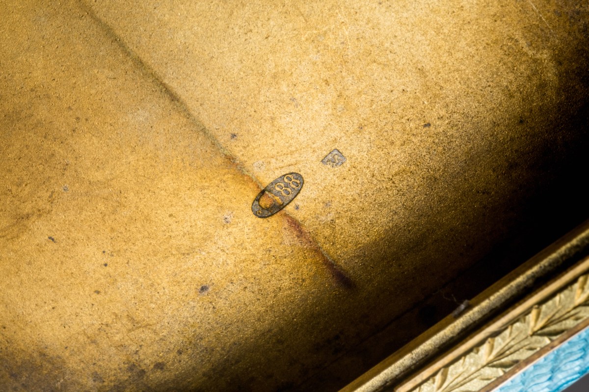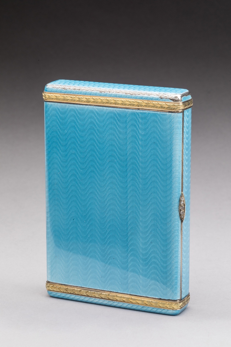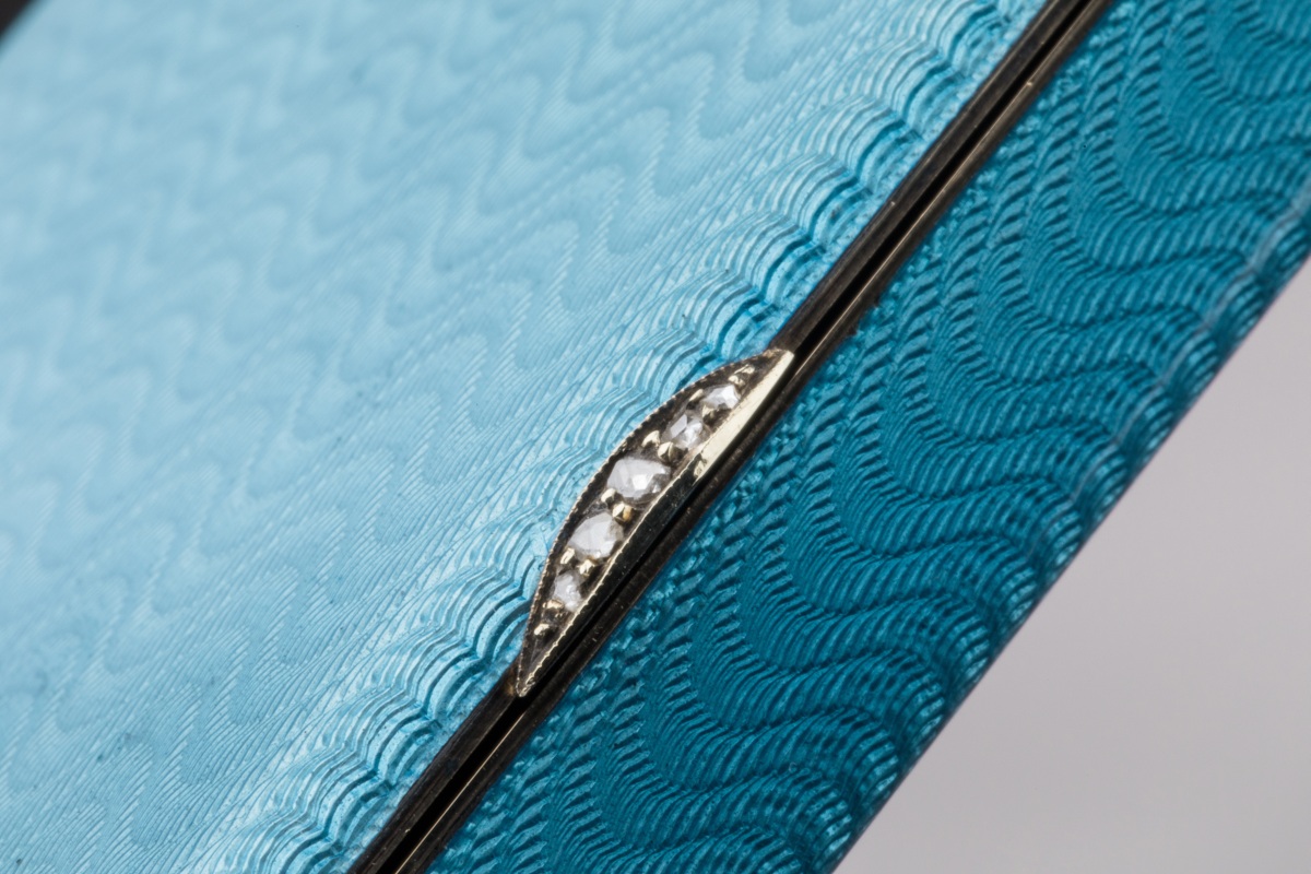 de forme rectangulaire en vermeil et émail bleu ciel transparent sur fond guilloché d'ondes. Les extrémités cerclées d'une frise en or de deux tons à décor d'une frise feuillagée. Le poussoir serti de cinq diamants taillés en rose.