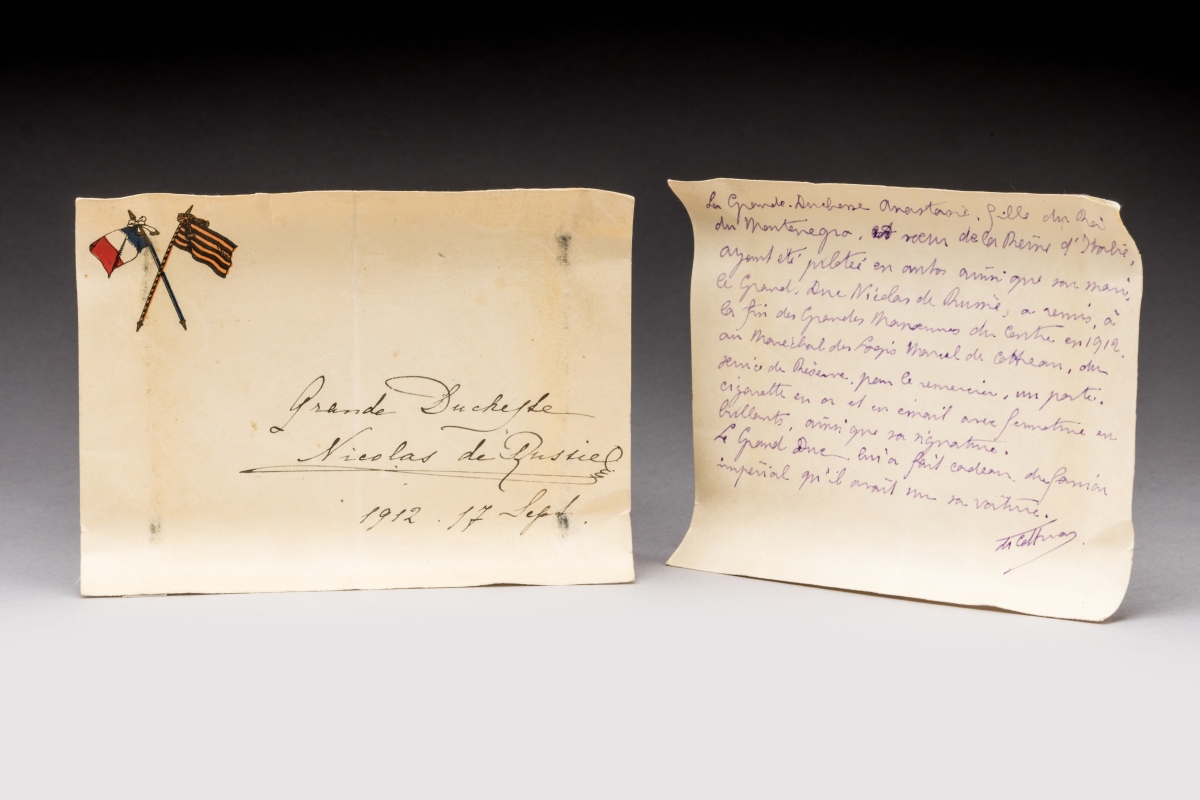 au verso : « La Grande Duchesse Anastasie, fille du Roi du Monténégro, soeur de la Reine d'Italie, ayant été pilotée en auto ainsi que son mari, le Grand-Duc Nicolas de Russie a remis à la fin des Grandes Manoeuvres du Centre en 1912 au Maréchal des Logis Marcel de Cotteau, du service de Réserve pour le remercier un porte-cigarette en or et en émail avec fermeture en brillants, ainsi que sa signature. Le Grand-Duc lui a fait cadeau du fanion impérial qu'il avait sur sa voiture. de Cotteau ».