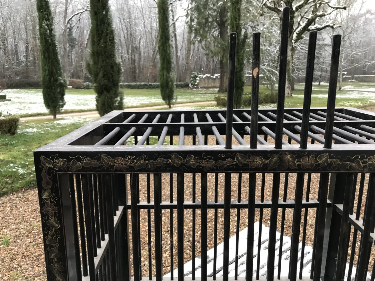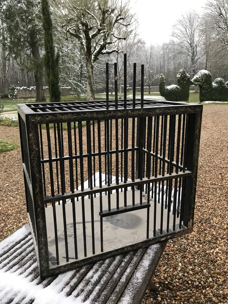 CAGE pour COQ DE COMBAT en laque noir à décor d'une frise feuillagées or. Japon. VENTE SUR PLACE du contenu du CHÂTEAU DE CONON, à Cellettes (41120), près de Blois, pour cause départ.