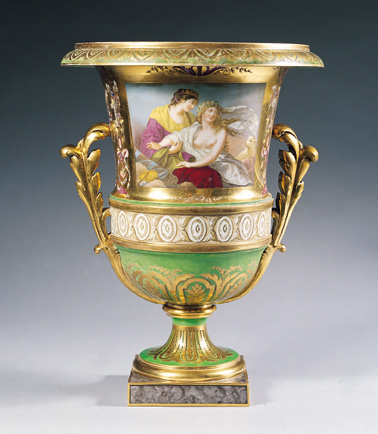 VASE MÉDICIS à fond vert clair orné de motifs d'arabesques polychromes dans le goût de Salembier sur fond or ; sur une face deux déesses de la Mythologie d'après Lagrenée ; sur l'autre face une large nature morte aux bouquets de fleurs. Socle à fond marbré, anses feuilles d'acanthe en dorure.