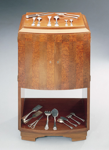MEUBLE-MÉNAGÈRE dissimulant cinq tiroirs en bois de placage de bois exotique et ronce, à bandes horizontales. Il ouvre à une porte bombée surmontant une niche.