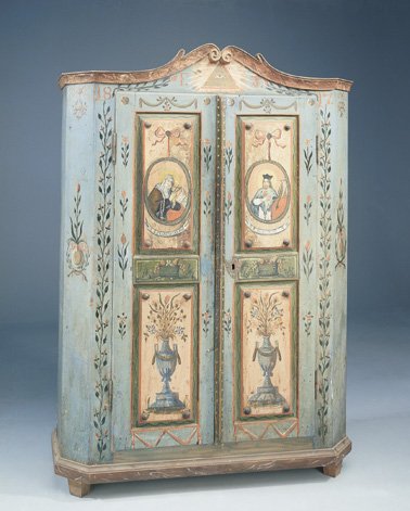ARMOIRE à pans coupés ouvrant à deux portes pleines en bois naturel peint en polychromie. Corniche à enroulement. Décor peint : fond ardoise orné en son centre d'un oeil placé dans un triangle, et en façade des guirlandes de fleurs. Les portes présentent dans le registre inférieur des vases sur piédouches fleuris et dans le registre supérieur des médaillons en trompe-l'oeil de S. FRANCISCAR. RU. et de S. IOHANNES. Elle porte la date de 1817.