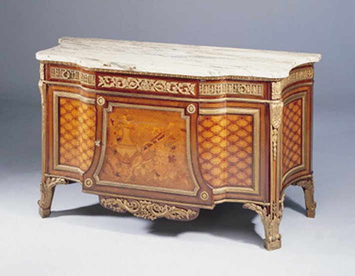 Historique : Copie d'une commode Louis XVI, exécutée au cours de la deuxième moitié du XIXème siècle. L'originale réalisée par RIESENER en 1778 est conservée au cabinet Intérieur de Louis XVI au château de Fontainebleau.