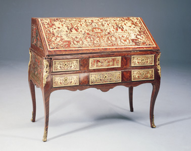 Riche BUREAU DOS D'ANE, dit secrétaire en pente, d'applique en bois de placage. Ornementation de scènes en marqueterie de Boulle - sur les trois faces - de laiton et écaille rouge, à décor à la Bérain, d'amours, de rinceaux, d'entrelacs et de personnages équestres.