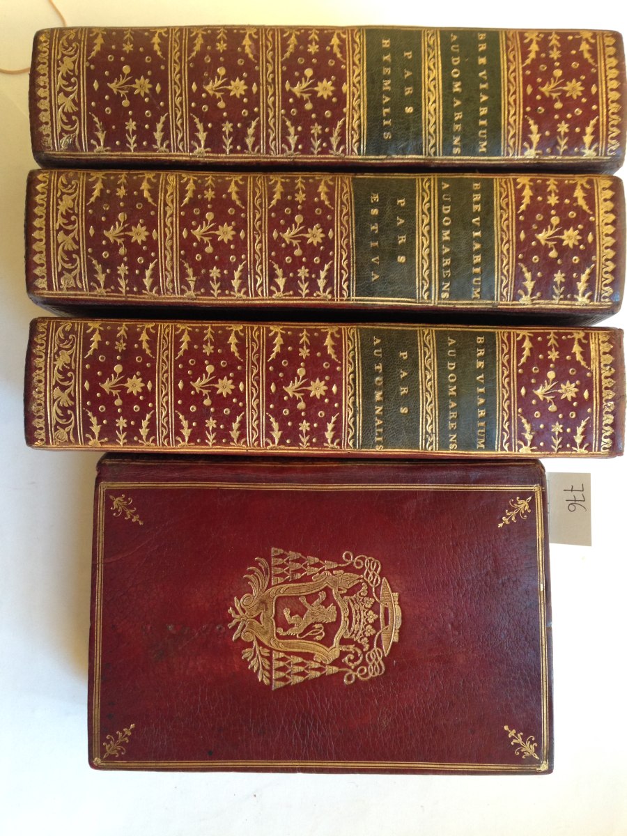 4 vol. in-8 (220 X 145 mm), plein maroquin du Levant cerise, triple filet d'encadrement, grandes armes au centre des plats de Alexandre-Joseph Marie-Alexis de Bruyères-Chalabre, "au lion rampant". Roulettes intérieures, toutes tranches dorées. Gardes de soie tabis bleu ciel. Reliures parisiennes de très grande qualité. (Papier fragilisé dans les marges inférieures du volume "Pars Autumnalis" et dans les marges supérieures du volume "Pars Aestiva").