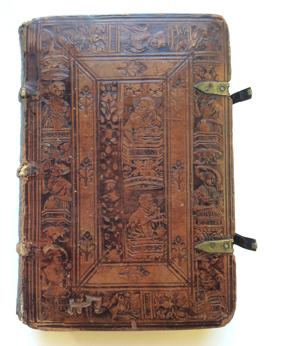 In-8, (32 feuillets), dont 2 blancs, 524 pages, (2 ff. blancs), (32 ff). 2 cartes sur double page (Espagne et Gaule), et 5 bois à pleine page. Veau du temps sur ais, avec un riche décor à froid composé d'une large roulette datée de 1535, avec les figures allégoriques Lucretia, Superbia, Prudentia, Justitia ; dans la partie centrale du premier plat, une figure avec les mots "Ecce Agnus Dei" datée 1535, et une autre portant les mots "Gratia per Ch". Sur le second plat, figure de Moïse :"Lex per M." et peut-être le nom du propriétaire : "P. Doctor Gen." Fermoirs de laiton conservés. (Infimes manques de cuir sur les nerfs).