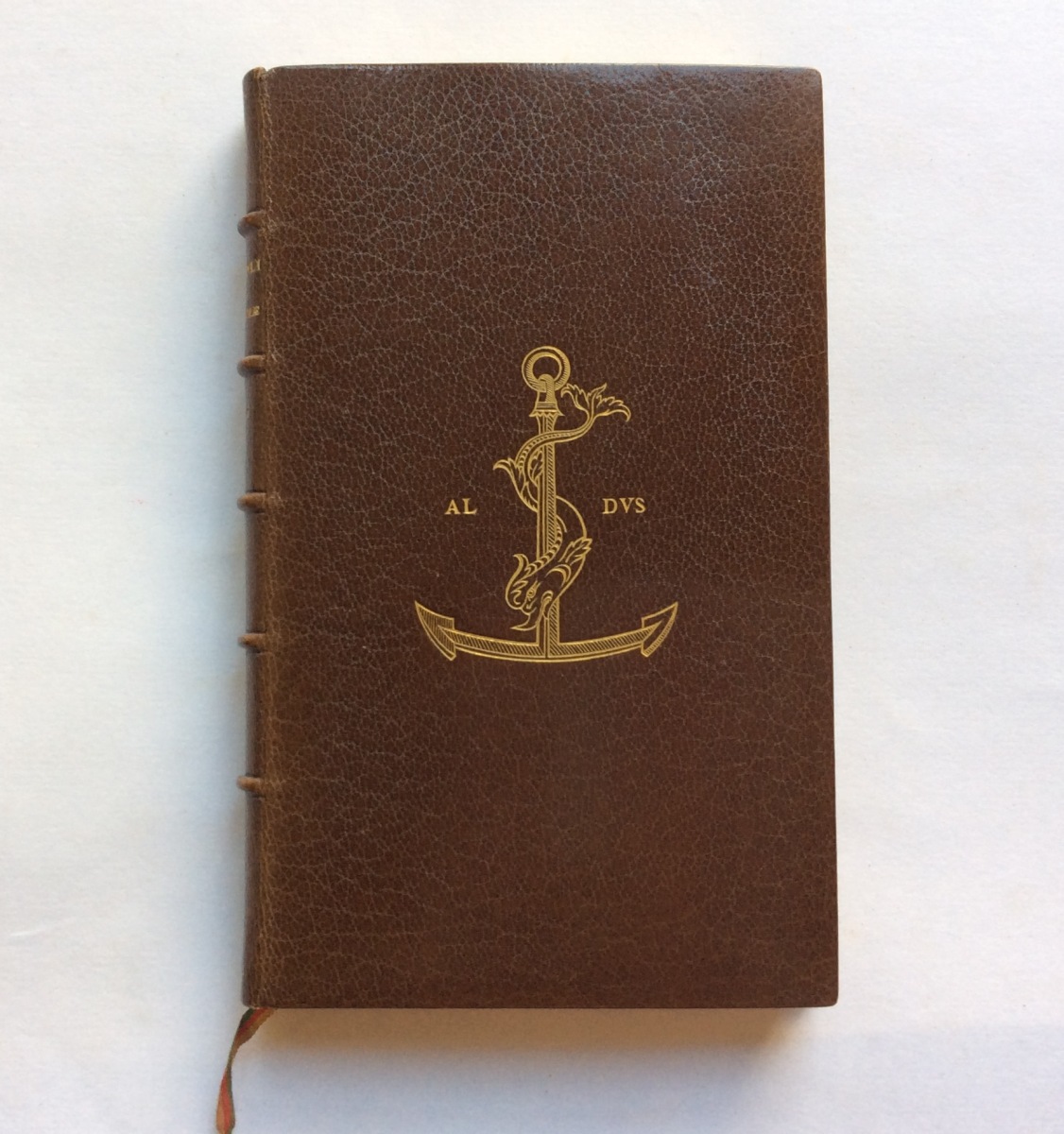 Petit in-8, 113 feuillets, (1f). Plein maroquin marron à gros grains écrasés ; marque aldine sur les deux plats ; double filet droit sur les coupes, large dentelle intérieure. Exemplaire lavé et parfaitement établi par Chambolle-Duru. (Déchirures sans manque dans le blanc du titre très habilement restaurées.)