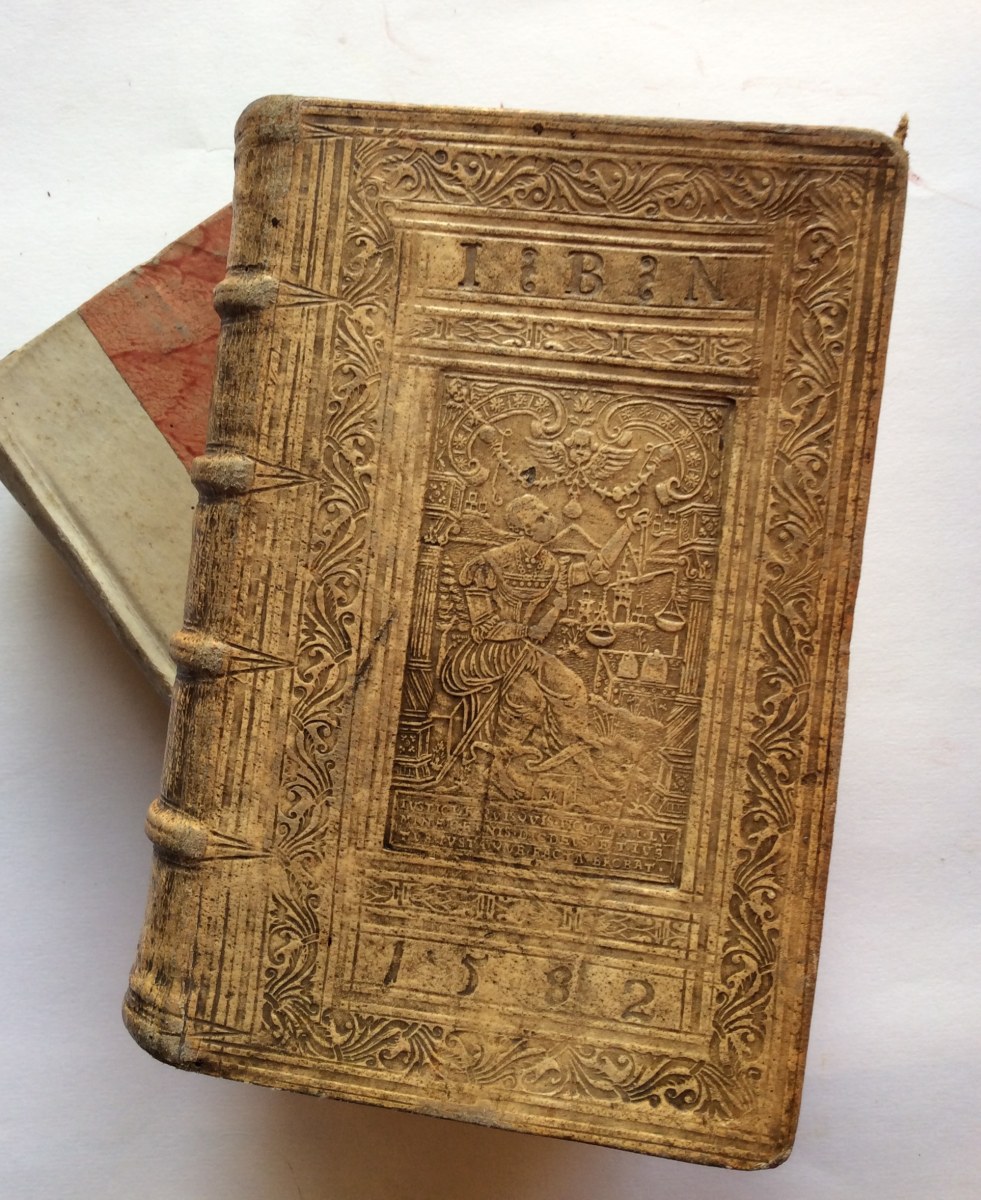 In-8, plein vélin estampé, larges roulettes d'encadrement, avec, sur le premier plat, au-dessous des initiales I.B.N. et de la date 1582, une riche plaque allégorique de la Justice, et sur le second plat une plaque allégorique du Destin (Fortuna). Reliure rhénane du temps.