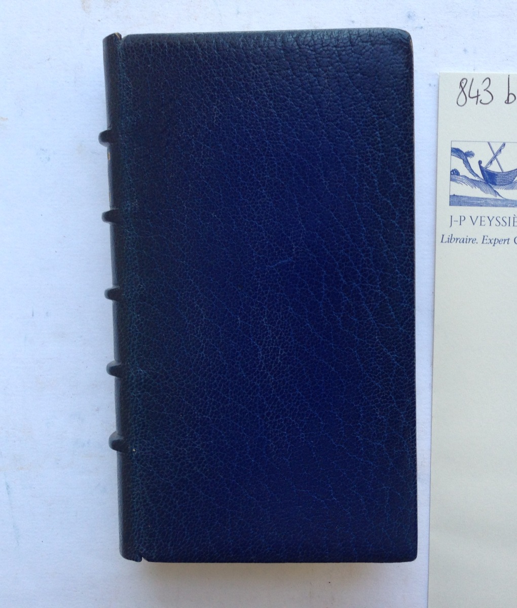 In-12, (12 ff) et 298 feuillets chiffrés par erreur 294. Plein maroquin janséniste bleu-nuit, à gros grains écrasés, filet droit sur les coupes, roulettes et filets intérieurs. Toutes tranches dorées. Exemplaire lavé. Le doreur, par ailleurs excellent, a frappé par erreur la date de 1633 en queue.