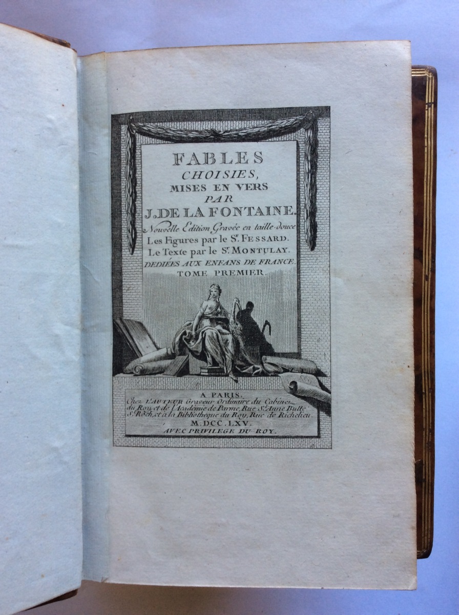 Fables choisies mises en vers par Jean de La Fontaine, nouvelle édition gravée en taille-douce, les figures par le Sr. Fessard, le texte par le Sr. Montulay, dédiée aux enfans de France.