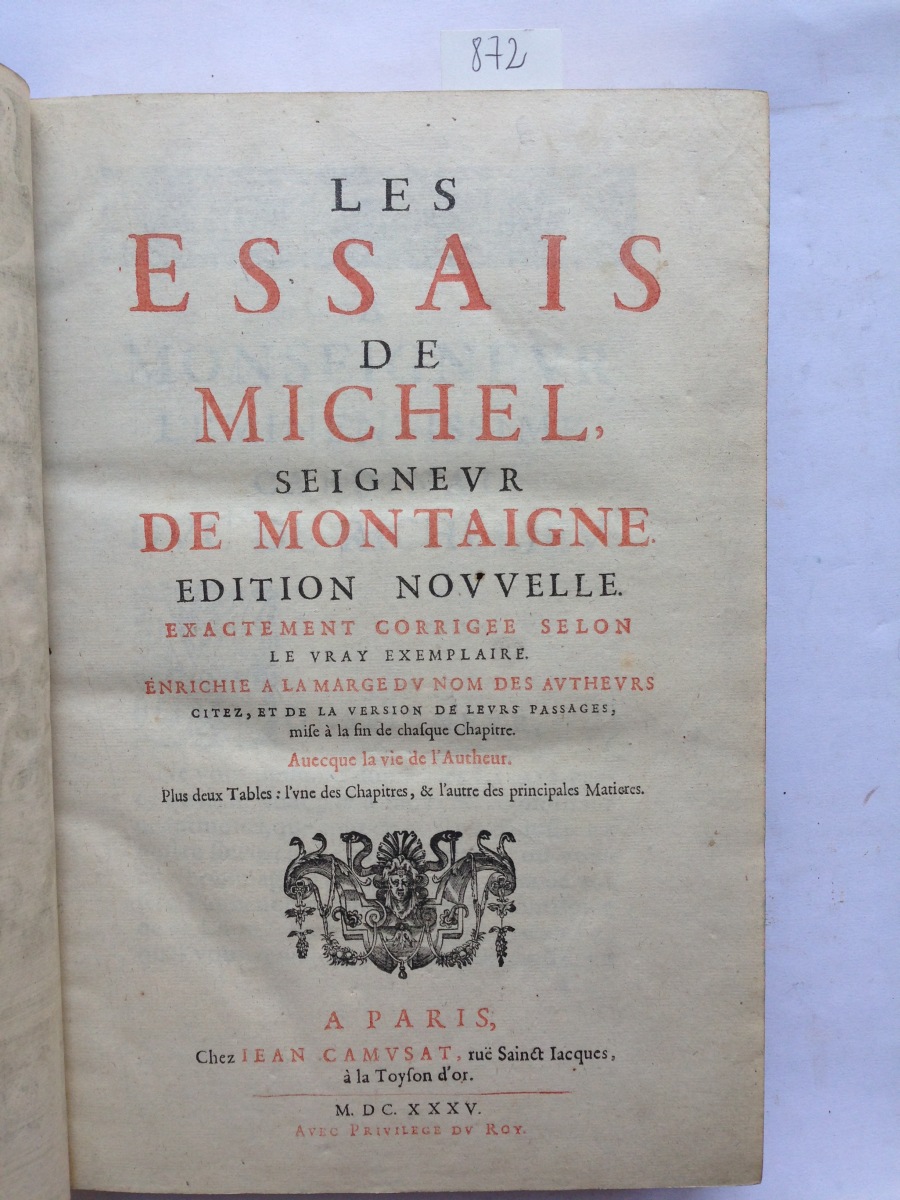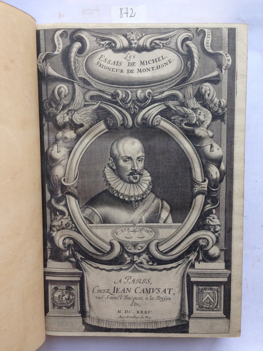 Les Essais de Michel, Seigneur de Montaigne. Edition nouvelle exactement corrigée selon le vrayexemplaire, enrichie à la marge du nom des autheurs cittez, et de la version de leurs passages mise à la fin de chaque chapitre. Avecque la vie de l'Autheur. Plus deux tables, l'une des chapitres et l'autre desprincipales matières.