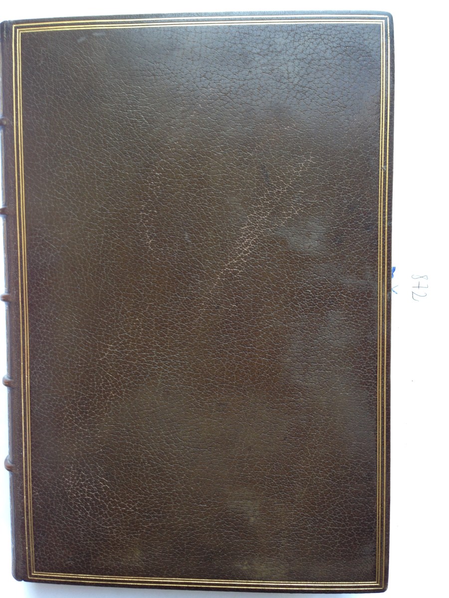 In-folio (348 X 225 mm). Titre-frontispice, (20 ff)dont le titre, 871 pages, (1 page de privilège) (11 ff. de table) Plein maroquin havane, trois filets d'encadrement, dos à nerfs, finement orné dans les entre-nerfs de fer Renaissance en arabesques, double filet sur les coupes, large décor intérieur composé de deux roulettes, de filets droits et de filets aux pointillés ; doubles gardes à la cuve ; toutes tranches dorées sur marbrure. Etui bordé de maroquin havane. Exemplaire lavé. Reliure signée Champs. (Le dernier feuillet blanc n'a pas été conservé).