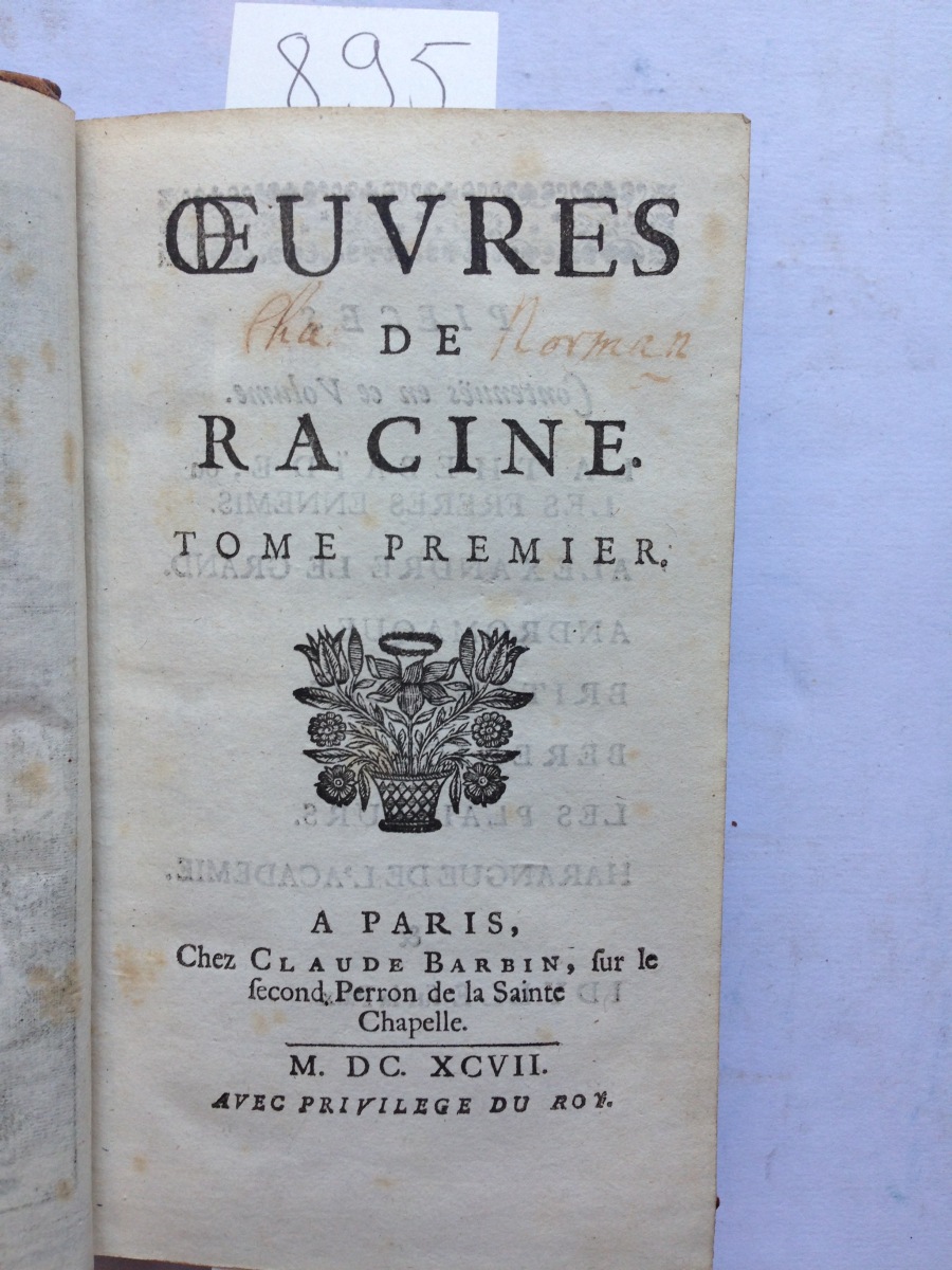 Troisième édition collective, et dernière donnée par Racine. "Elle fixe le texte définitif de son oeuvre. Racine y a fait quelques modificationsd'orthographe, et a supprimé quelques vers dans La Thébaïde et Bajazet". Exemplaire avec 2 cartons seulement (pp. 146 et 163) des 9 indiqués par Tchemerzine (Tchemerzine, IX, 360)
