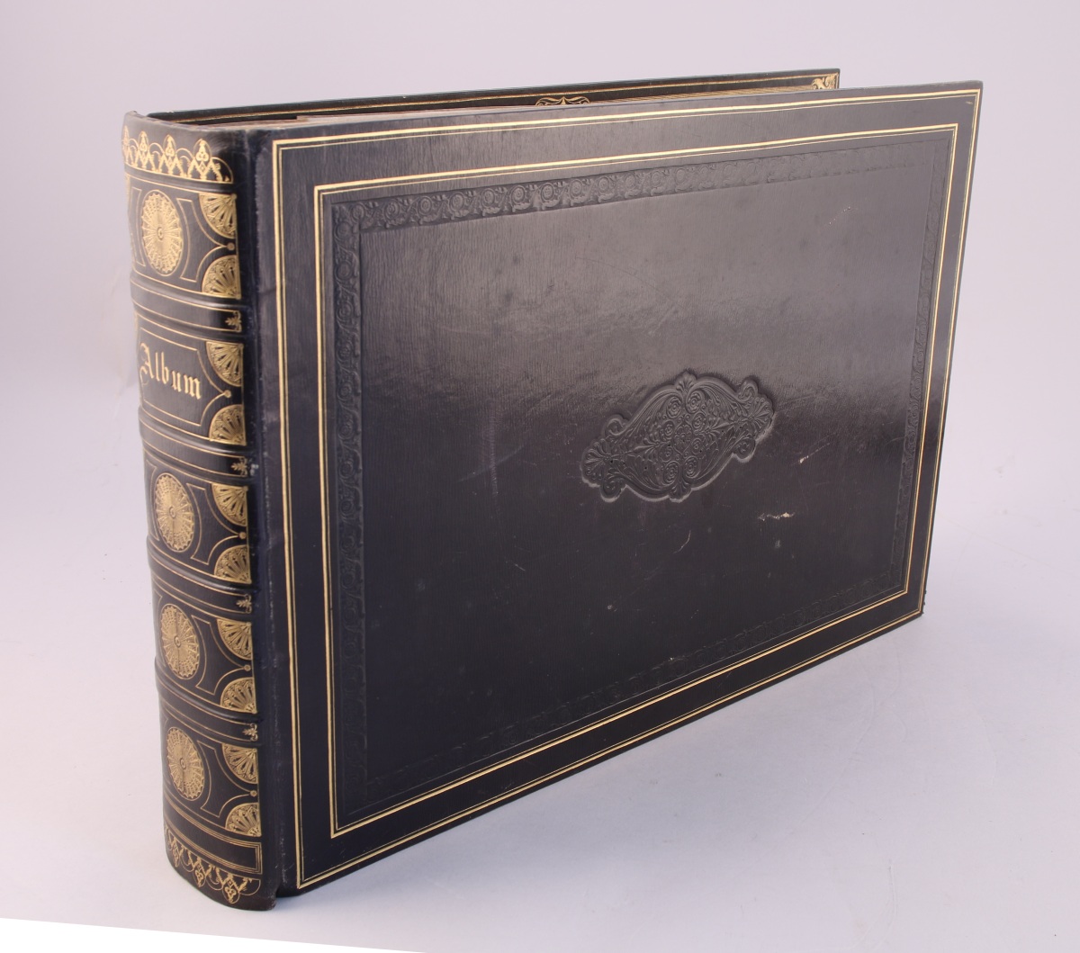IMPORTANTE RELIURE d'ALBUM en cuir/chagrin ? de couleur aubergine finement ouvragé de fers à l'or fin. Nombreux feuillets intercallés de papier de soie.