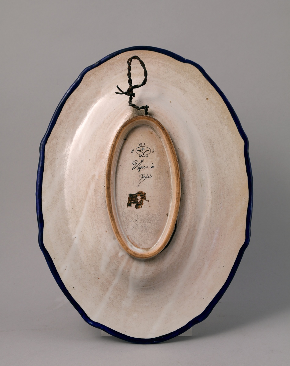 BLOIS. Ulysse BESNARD, dit ULYSSE (1826-1899). DEUX PLATS de forme ovale formant paire, à décor de personnages Renaissance, hommes armés d'épées et costumés à la mode du XVIe siècle, encadrés de frise d'arabesques, de dauphins et de salamandres. Signés dans le décor et au revers "Ulysse à Blois" et datés l'un 1884, l'autre 1885.