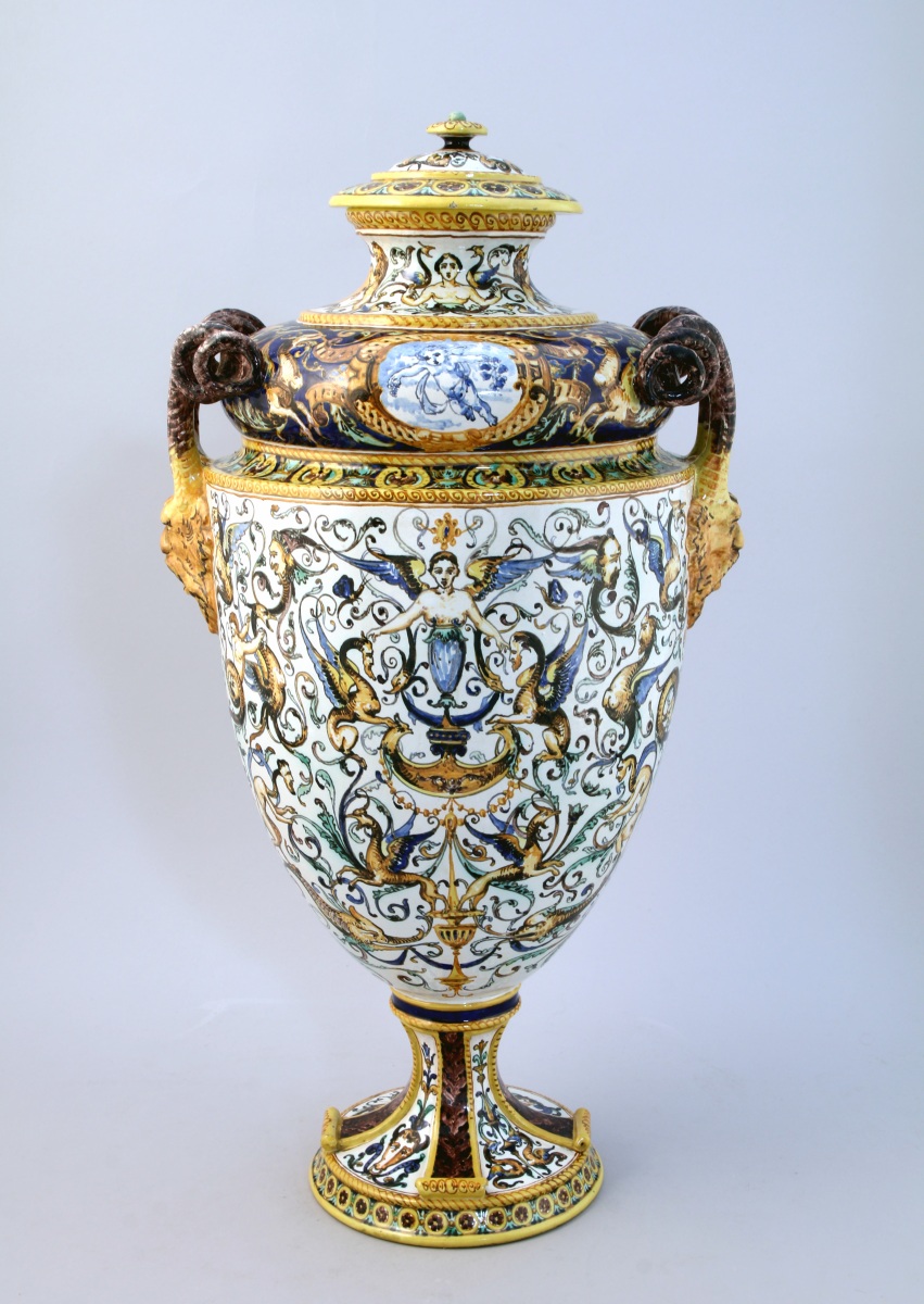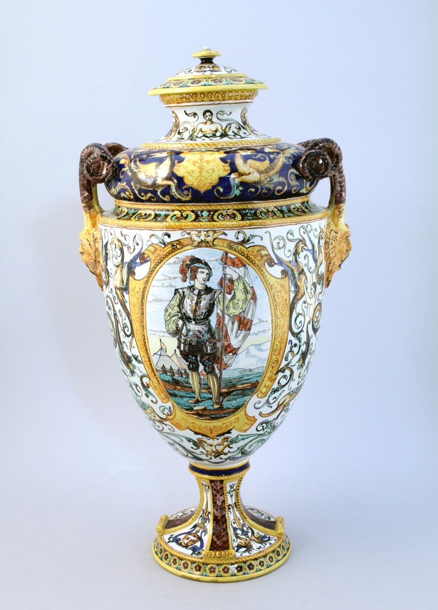 BLOIS. Ulysse BESNARD, dit ULYSSE (1826-1899) Importante URNE couverte de forme balustre en faïence à riche décor polychrome d'une réserve figurant un soldat renaissance sur fond de camp militaire. De forme ovale, encadrée de cuirs découpés, elle s'inscrit sur un fond de grotesques à décor de chimères et personnages phytomorphes dans des rinceaux. Les anses adoptent la forme d'un mascaron à cornes enroulées. Il repose sur un piédouche à enroulements. Signature à la coquille "Vlisse Blois". Daté de mars 1870.