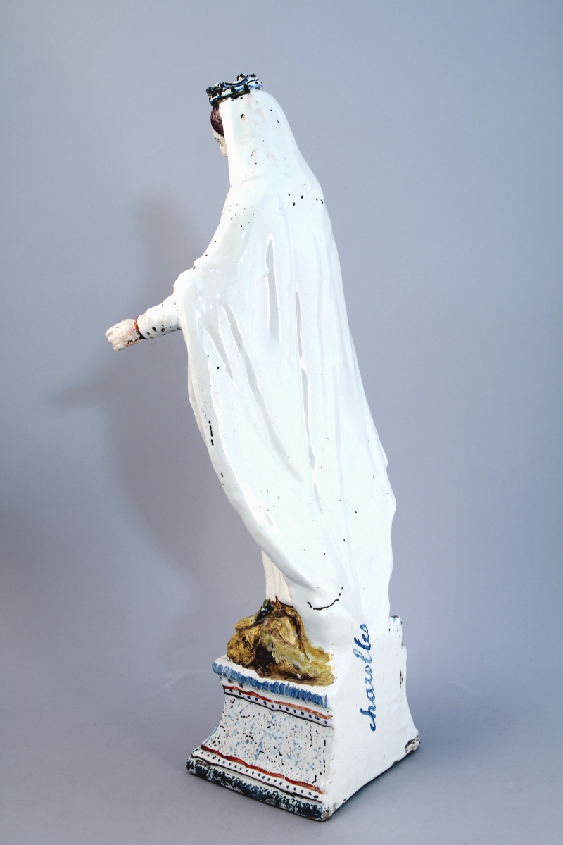 CHAROLLES. Grande STATUETTE en faïence émaillée polychrome figurant sainte Barbe. Elle est couronnée et repose sur un tertre herbeux. Socle de forme trapézoïdale. Marquée au dos en bleu sous couverte "Charolles".
