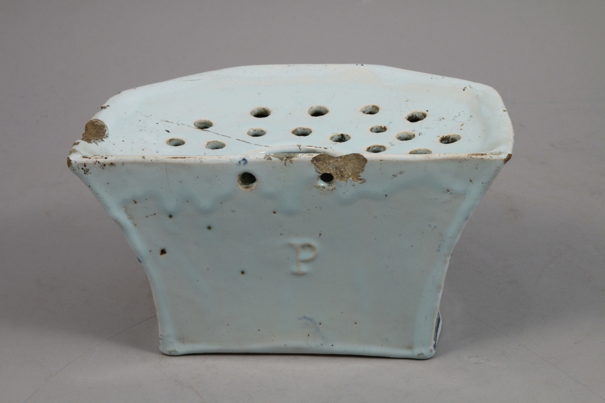 ROUEN. BOUQUETIÈRE d'applique à pans coupés en faïence de petit feu, à décor bleu et rouge de lambrequins et de fleurs.