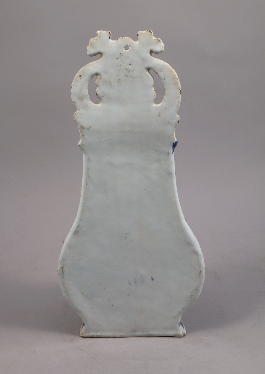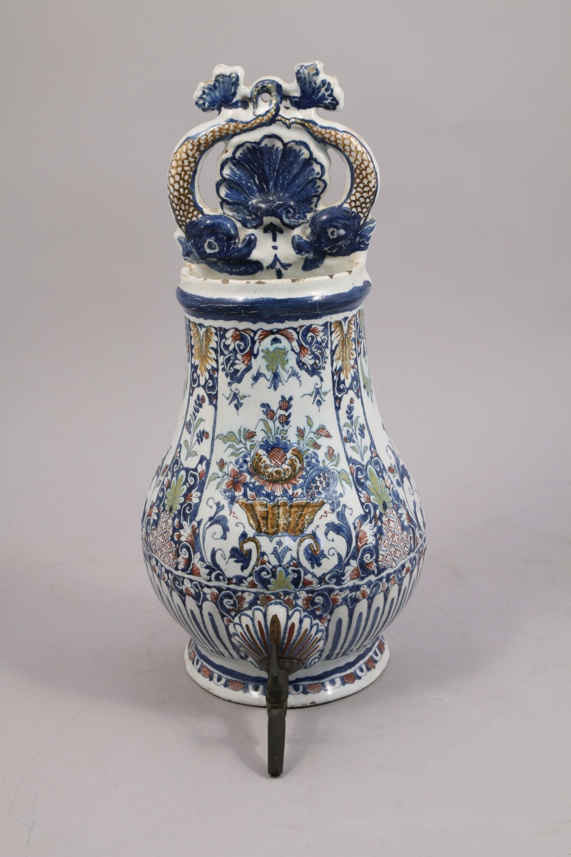 ROUEN. FONTAINE d'applique de forme balustre en faïence polychrome de petit feu, à décor de fleurs, lambrequins et palmettes. Le fronton formé de deux dauphins affrontés autour d'une coquille. Le déversoir en forme de coquille. Marqué d'un "M" au revers.