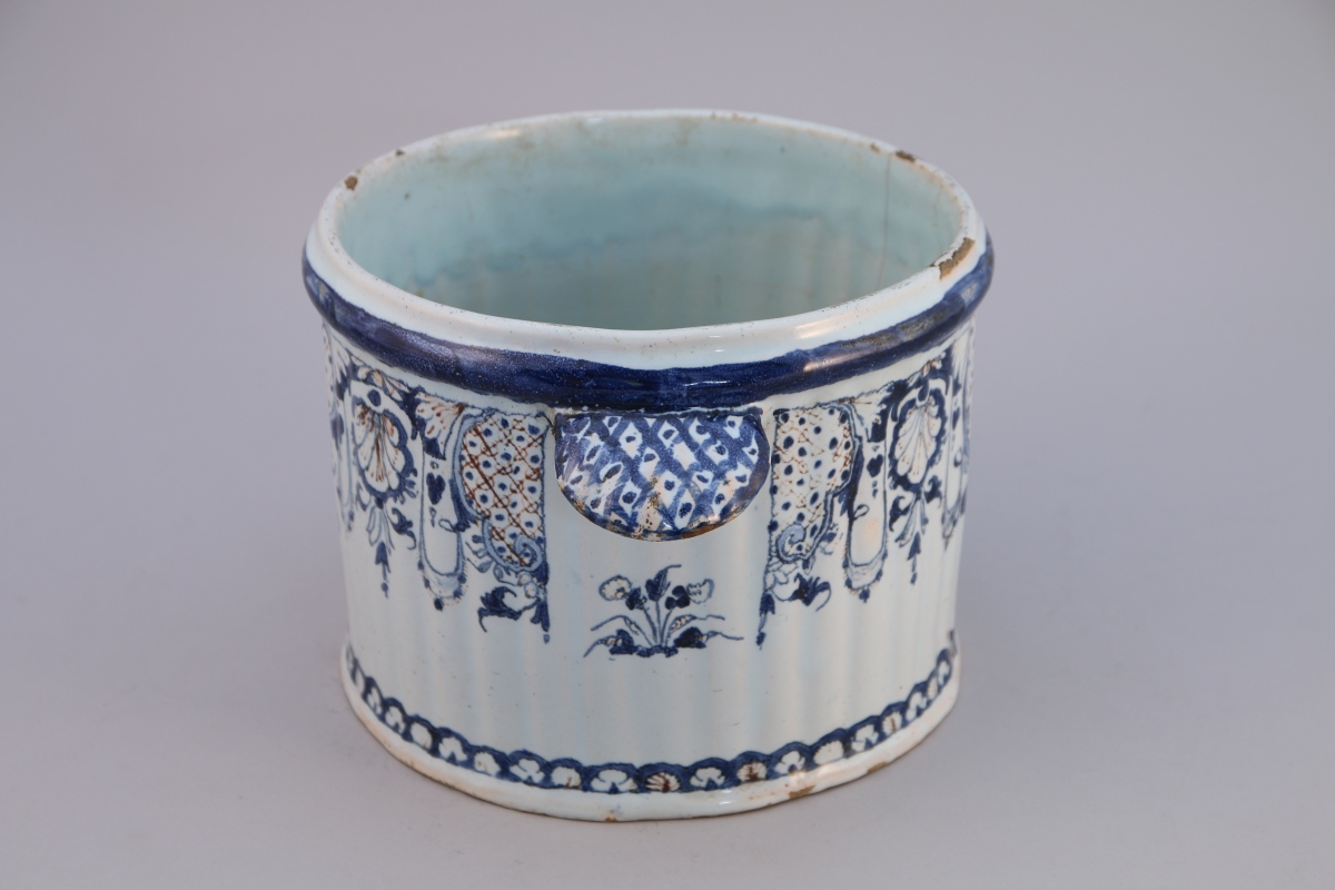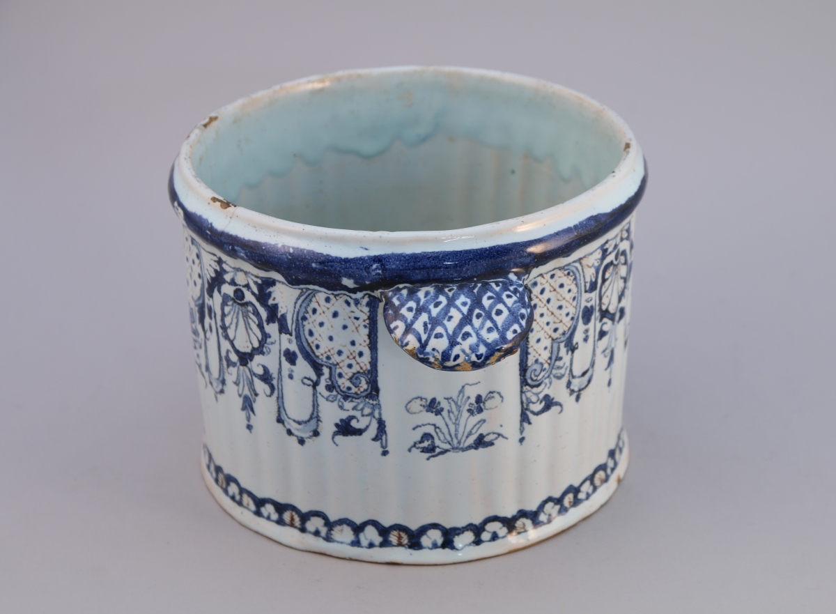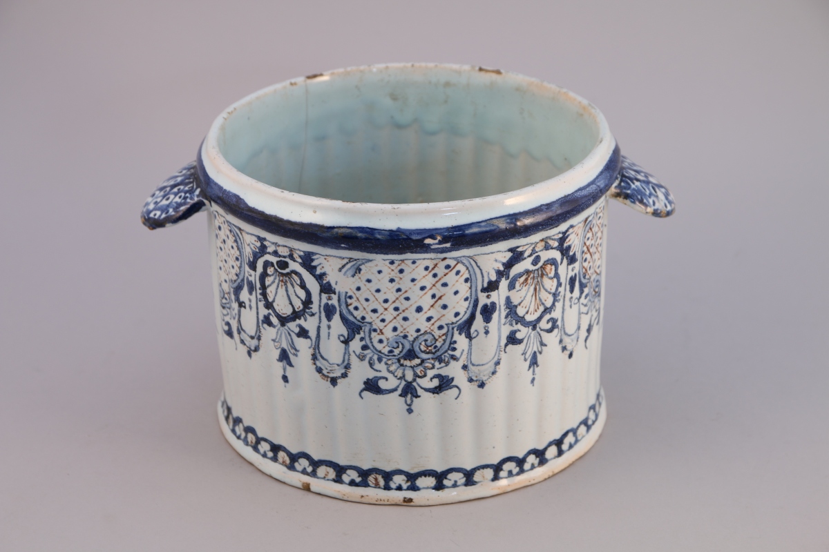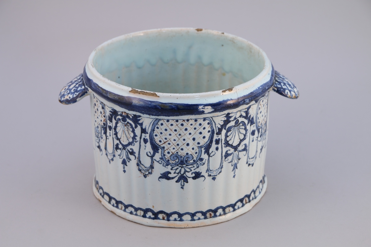 ROUEN. RAFRAîCHISSOIR à BOUTEILLES en faïence de forme circulaire à anses. La panse godronnée à décor en camaïeu bleu de lambrequins feuillagés et coquilles. Une marque au revers.