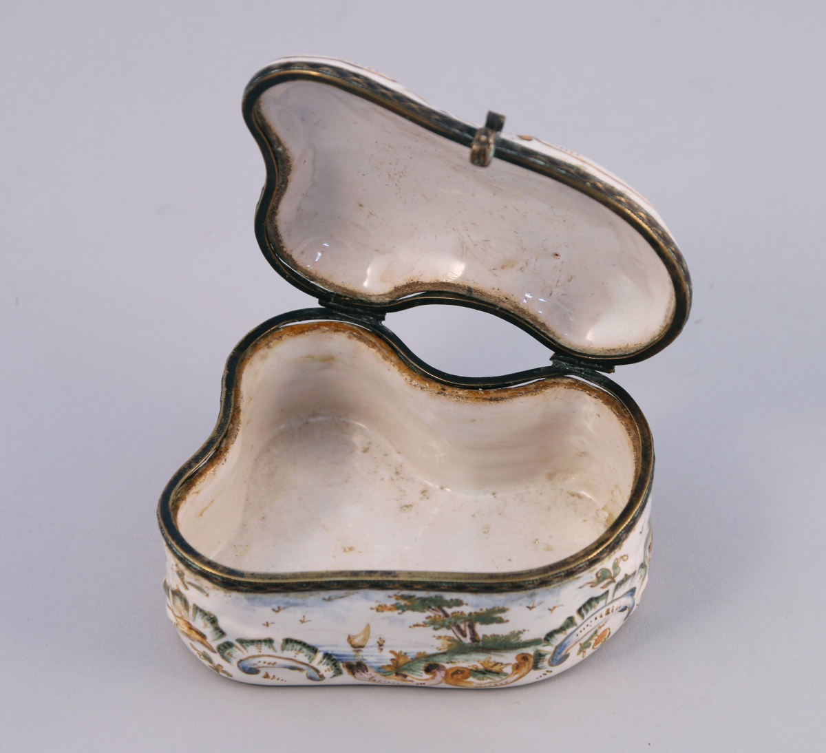 MOUSTIERS, genre de. BOÎTE asymétrique de forme chantournée en faïence à décor polychrome d'une scène galante, de paysages lacustres et d'agrafes feuillagées.