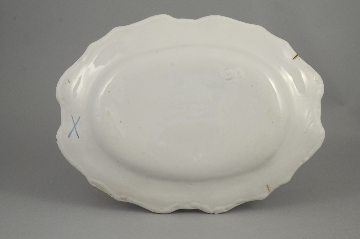 MOUSTIERS. PLAT ovale à bordure contournée. Décor en camaïeu orange d'un homme en robe et d'un joueur d'instrument de musique, entourés de fleurs. XVIIIe.