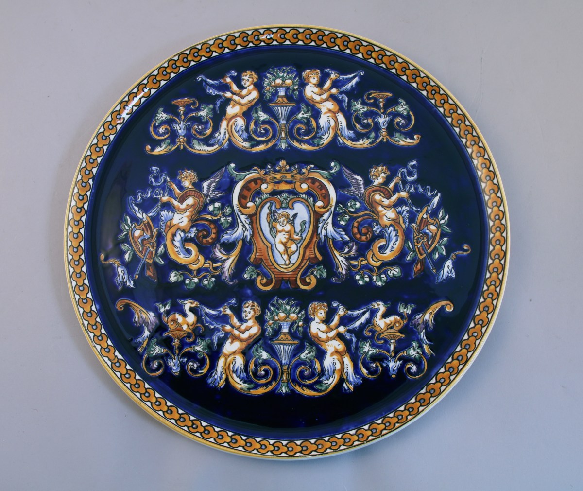 JOINT : GIEN. Plat à décors de grotesques à fond bleu, à la façon des majoliques de la Renaissance italienne. Marque "GIEN FRANCE" au dessous. XXe Diam. 32 cm.