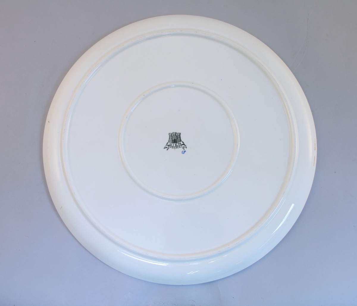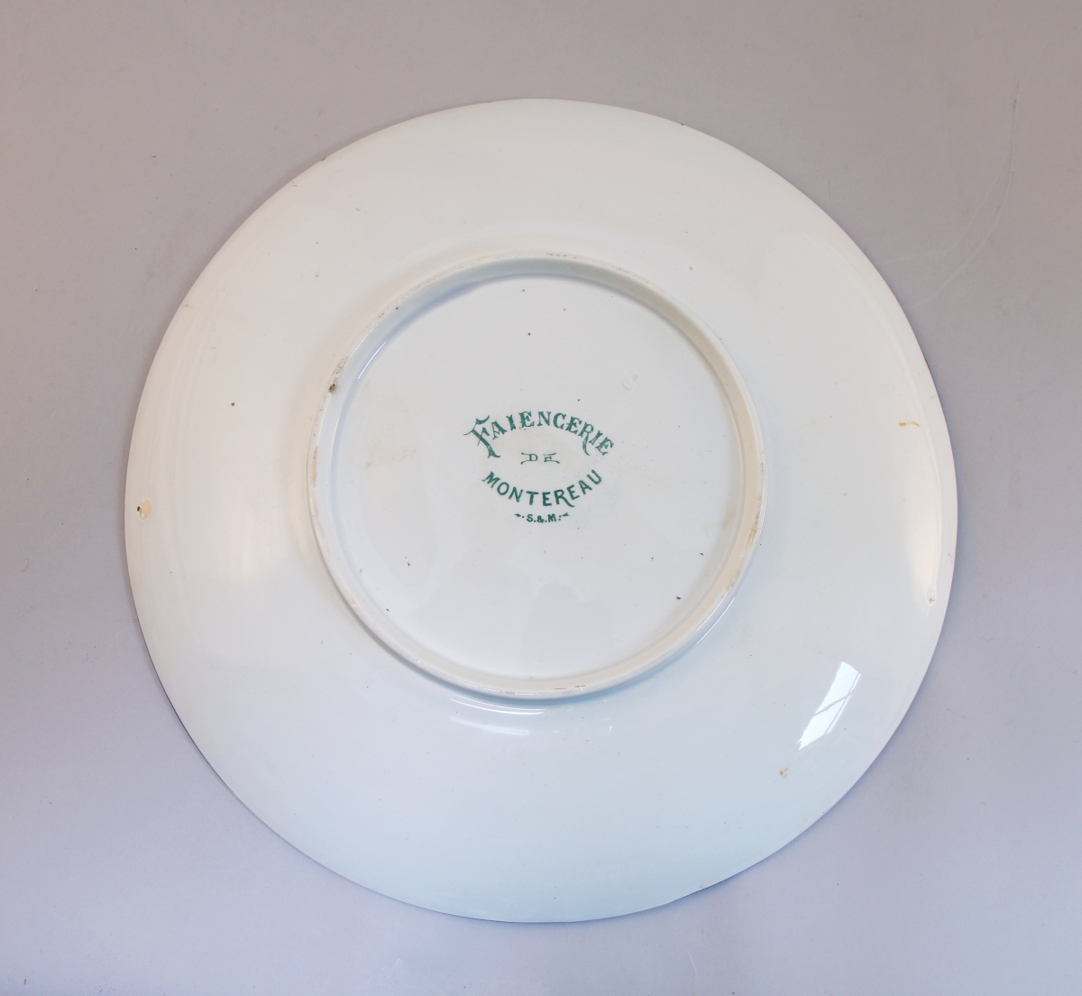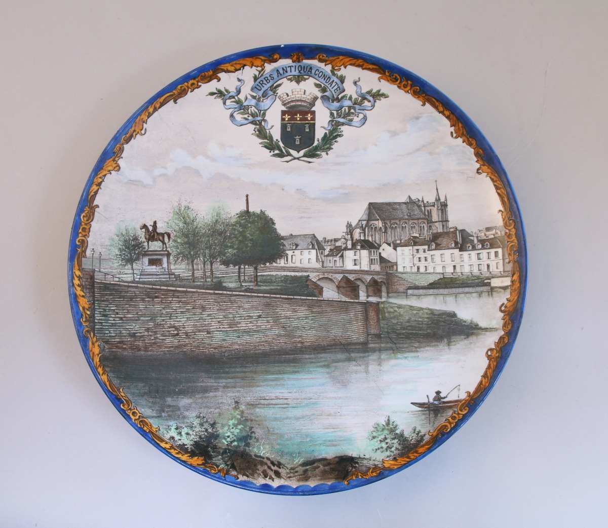 MONTEREAU. Plat présentant un décor mécanique aux armes et à la vue de la ville de Montereau "Urbs Antiqua Condate". Marque "FAÏENCERIE DE MONTEREAU, S&M" au revers.